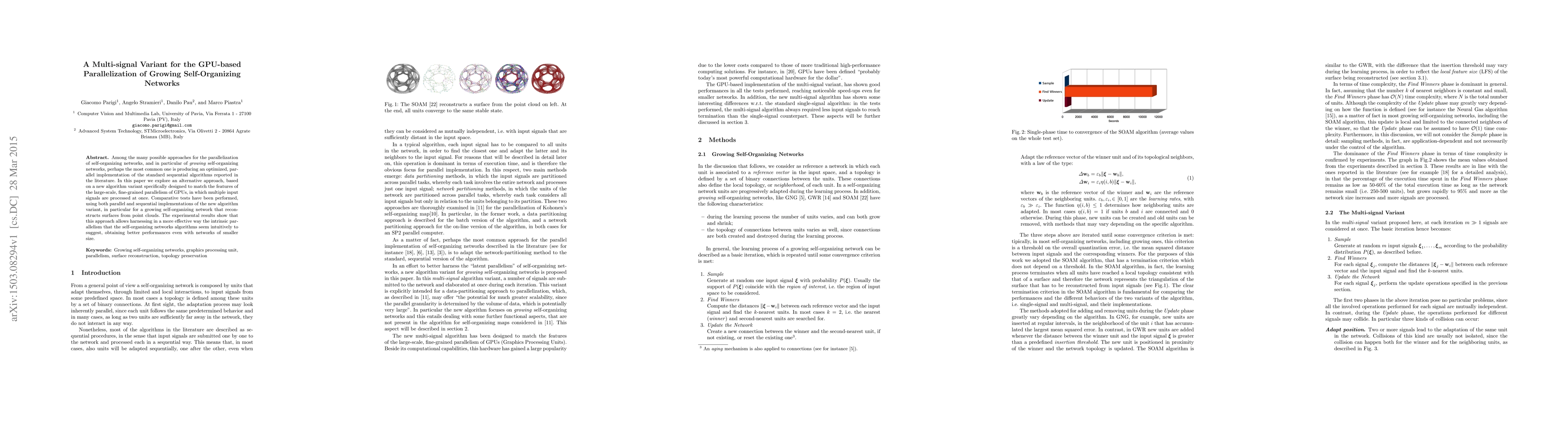 This paper proposes a GPU-based parallel algorithm variant for growing self-organizing networks that processes multiple input signals simultaneously, demonstrating improved performance over sequential implementations, even with smaller network sizes. Comparative tests show the effectiveness of this multi-signal parallelization approach in reconstructing surfaces from point clouds.