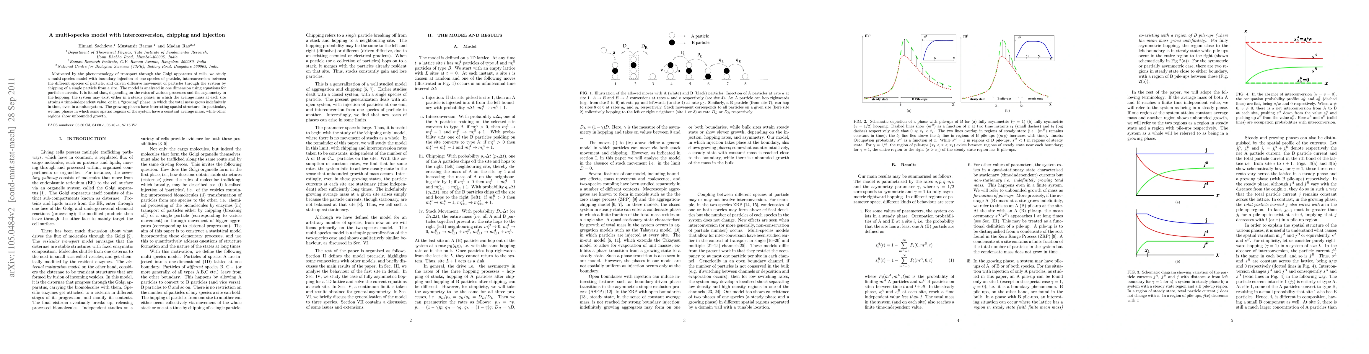 This research explores a one-dimensional multi-species model simulating transport through the Golgi apparatus, featuring particle injection, interconversion, and chipping-driven diffusion. The model reveals steady or growing phases depending on process rates and hopping asymmetry, with some regions exhibiting constant mass while others show unbounded growth.