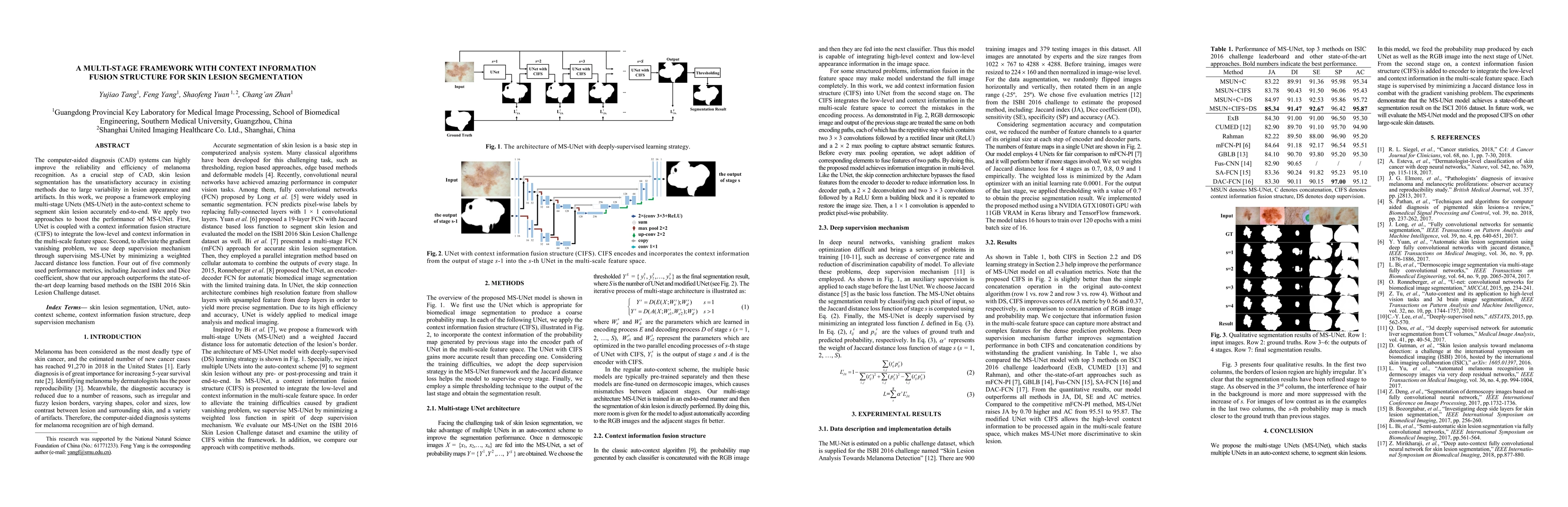 This paper proposes a multi-stage U-Net framework (MS-UNet) with context information fusion for accurate skin lesion segmentation in CAD systems. The approach integrates low-level and context information and uses deep supervision to mitigate gradient vanishing, outperforming existing methods on the ISBI 2016 dataset.