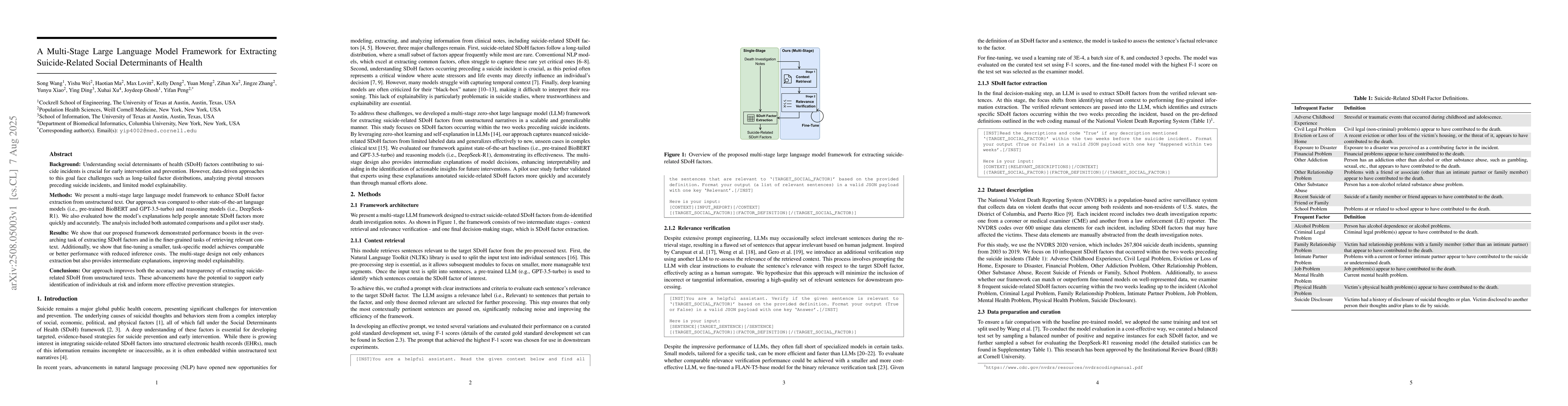 Background: Understanding social determinants of health (SDoH) factors contributing to suicide incidents is crucial for early intervention and prevention. However, data-driven approaches to this goal face challenges such as long-tailed factor distributions, analyzing pivotal stressors preceding suicide incidents, and limited model explainability. Methods: We present a multi-stage large language model framework to enhance SDoH factor extraction from unstructured text. Our approach was compared to other state-of-the-art language models (i.e., pre-trained BioBERT and GPT-3.5-turbo) and reasoning models (i.e., DeepSeek-R1). We also evaluated how the model's explanations help people annotate SDoH factors more quickly and accurately. The analysis included both automated comparisons and a pilot user study. Results: We show that our proposed framework demonstrated performance boosts in the overarching task of extracting SDoH factors and in the finer-grained tasks of retrieving relevant context. Additionally, we show that fine-tuning a smaller, task-specific model achieves comparable or better performance with reduced inference costs. The multi-stage design not only enhances extraction but also provides intermediate explanations, improving model explainability. Conclusions: Our approach improves both the accuracy and transparency of extracting suicide-related SDoH from unstructured texts. These advancements have the potential to support early identification of individuals at risk and inform more effective prevention strategies.