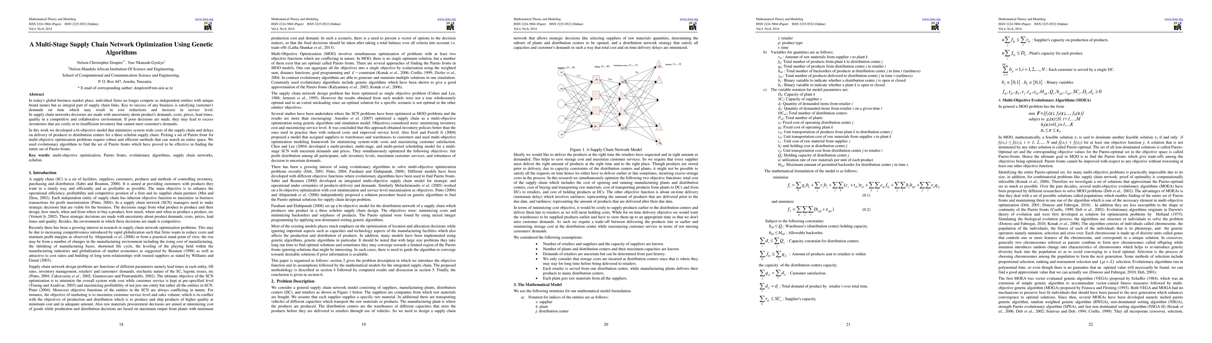 In today's global business market place, individual firms no longer compete as independent entities with unique brand names but as integral part of supply chain links. Key to success of any business is satisfying customer's demands on time which may result in cost reductions and increase in service level. In supply chain networks decisions are made with uncertainty about product's demands, costs, prices, lead times, quality in a competitive and collaborative environment. If poor decisions are made, they may lead to excess inventories that are costly or to insufficient inventory that cannot meet customer's demands. In this work we developed a bi-objective model that minimizes system wide costs of the supply chain and delays on delivery of products to distribution centers for a three echelon supply chain. Picking a set of Pareto front for multi-objective optimization problems require robust and efficient methods that can search an entire space. We used evolutionary algorithms to find the set of Pareto fronts which have proved to be effective in finding the entire set of Pareto fronts.