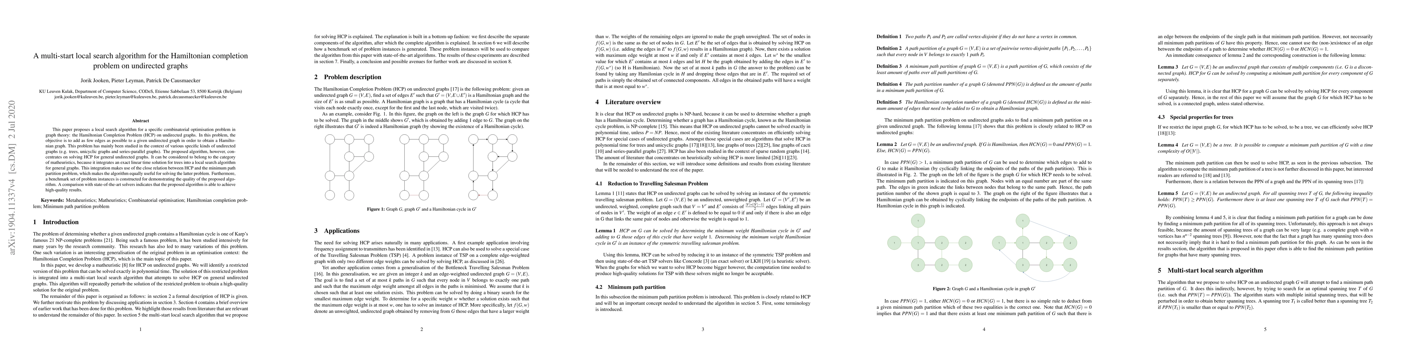 This paper proposes a local search algorithm for a specific combinatorial optimisation problem in graph theory: the Hamiltonian Completion Problem (HCP) on undirected graphs. In this problem, the objective is to add as few edges as possible to a given undirected graph in order to obtain a Hamiltonian graph. This problem has mainly been studied in the context of various specific kinds of undirected graphs (e.g. trees, unicyclic graphs and series-parallel graphs). The proposed algorithm, however, concentrates on solving HCP for general undirected graphs. It can be considered to belong to the category of matheuristics, because it integrates an exact linear time solution for trees into a local search algorithm for general graphs. This integration makes use of the close relation between HCP and the minimum path partition problem, which makes the algorithm equally useful for solving the latter problem. Furthermore, a benchmark set of problem instances is constructed for demonstrating the quality of the proposed algorithm. A comparison with state-of-the-art solvers indicates that the proposed algorithm is able to achieve high-quality results.