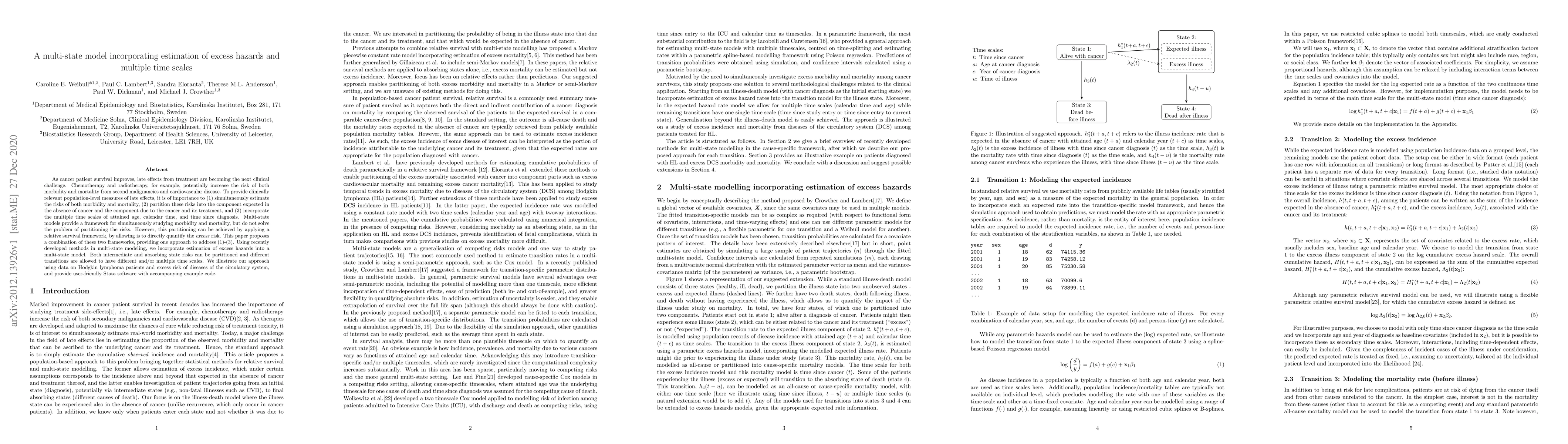 As cancer patient survival improves, late effects from treatment are becoming the next clinical challenge. Chemotherapy and radiotherapy, for example, potentially increase the risk of both morbidity and mortality from second malignancies and cardiovascular disease. To provide clinically relevant population-level measures of late effects, it is of importance to (1) simultaneously estimate the risks of both morbidity and mortality, (2) partition these risks into the component expected in the absence of cancer and the component due to the cancer and its treatment, and (3) incorporate the multiple time scales of attained age, calendar time, and time since diagnosis. Multi-state models provide a framework for simultaneously studying morbidity and mortality, but do not solve the problem of partitioning the risks. However, this partitioning can be achieved by applying a relative survival framework, by allowing is to directly quantify the excess risk. This paper proposes a combination of these two frameworks, providing one approach to address (1)-(3). Using recently developed methods in multi-state modeling, we incorporate estimation of excess hazards into a multi-state model. Both intermediate and absorbing state risks can be partitioned and different transitions are allowed to have different and/or multiple time scales. We illustrate our approach using data on Hodgkin lymphoma patients and excess risk of diseases of the circulatory system, and provide user-friendly Stata software with accompanying example code.