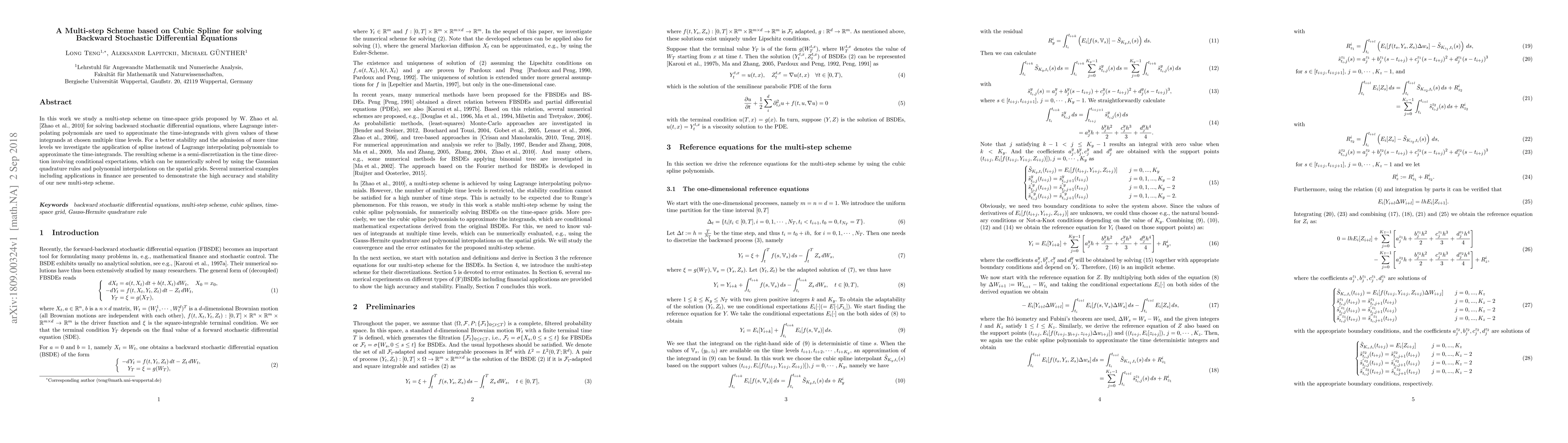 In this work we study a multi-step scheme on time-space grids proposed by W. Zhao et al. [28] for solving backward stochastic differential equations, where Lagrange interpolating polynomials are used to approximate the time-integrands with given values of these integrands at chosen multiple time levels. For a better stability and the admission of more time levels we investigate the application of spline instead of Lagrange interpolating polynomials to approximate the time-integrands. The resulting scheme is a semi-discretization in the time direction involving conditional expectations, which can be numerically solved by using the Gaussian quadrature rules and polynomial interpolations on the spatial grids. Several numerical examples including applications in finance are presented to demonstrate the high accuracy and stability of our new multi-step scheme.