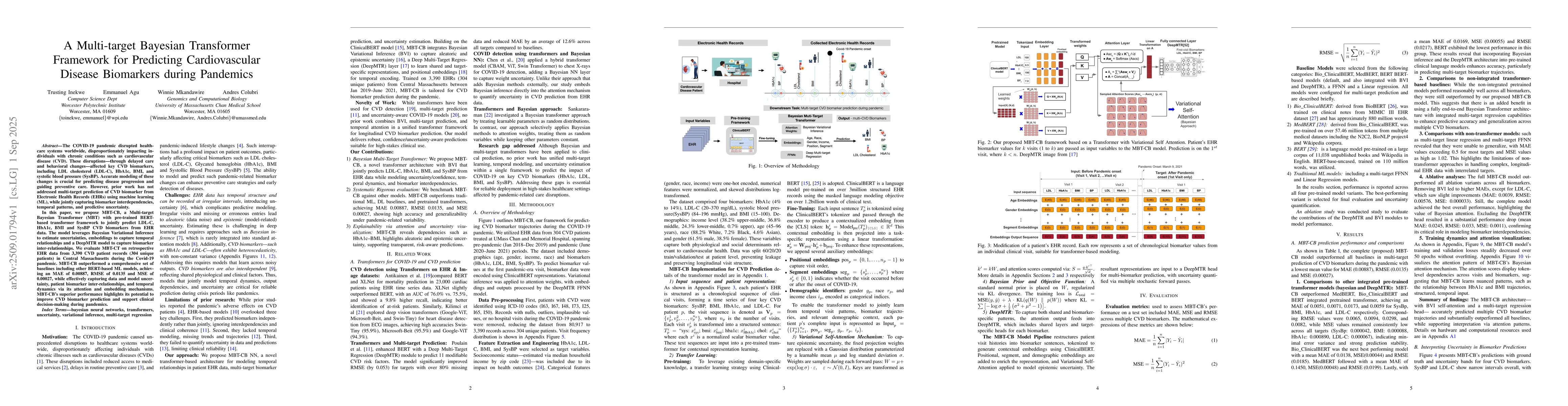 The COVID-19 pandemic disrupted healthcare systems worldwide, disproportionately impacting individuals with chronic conditions such as cardiovascular disease (CVD). These disruptions -- through delayed care and behavioral changes, affected key CVD biomarkers, including LDL cholesterol (LDL-C), HbA1c, BMI, and systolic blood pressure (SysBP). Accurate modeling of these changes is crucial for predicting disease progression and guiding preventive care. However, prior work has not addressed multi-target prediction of CVD biomarker from Electronic Health Records (EHRs) using machine learning (ML), while jointly capturing biomarker interdependencies, temporal patterns, and predictive uncertainty. In this paper, we propose MBT-CB, a Multi-target Bayesian Transformer (MBT) with pre-trained BERT-based transformer framework to jointly predict LDL-C, HbA1c, BMI and SysBP CVD biomarkers from EHR data. The model leverages Bayesian Variational Inference to estimate uncertainties, embeddings to capture temporal relationships and a DeepMTR model to capture biomarker inter-relationships. We evaluate MBT-CT on retrospective EHR data from 3,390 CVD patient records (304 unique patients) in Central Massachusetts during the Covid-19 pandemic. MBT-CB outperformed a comprehensive set of baselines including other BERT-based ML models, achieving an MAE of 0.00887, RMSE of 0.0135 and MSE of 0.00027, while effectively capturing data and model uncertainty, patient biomarker inter-relationships, and temporal dynamics via its attention and embedding mechanisms. MBT-CB's superior performance highlights its potential to improve CVD biomarker prediction and support clinical decision-making during pandemics.