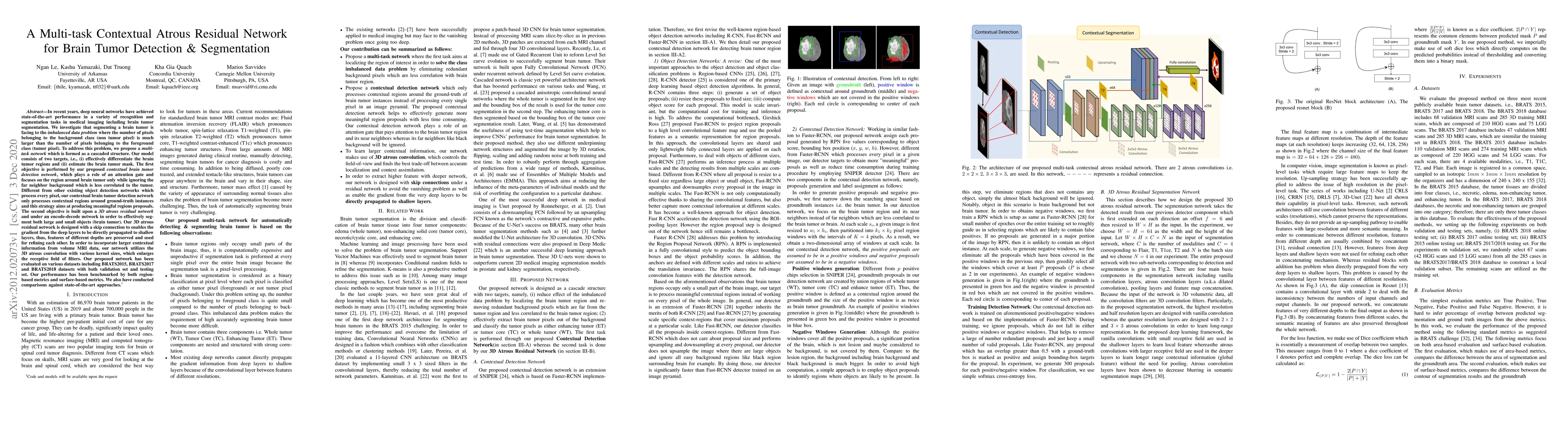 In recent years, deep neural networks have achieved state-of-the-art performance in a variety of recognition and segmentation tasks in medical imaging including brain tumor segmentation. We investigate that segmenting a brain tumor is facing to the imbalanced data problem where the number of pixels belonging to the background class (non tumor pixel) is much larger than the number of pixels belonging to the foreground class (tumor pixel). To address this problem, we propose a multi-task network which is formed as a cascaded structure. Our model consists of two targets, i.e., (i) effectively differentiate the brain tumor regions and (ii) estimate the brain tumor mask. The first objective is performed by our proposed contextual brain tumor detection network, which plays a role of an attention gate and focuses on the region around brain tumor only while ignoring the far neighbor background which is less correlated to the tumor. The second objective is built upon a 3D atrous residual network and under an encode-decode network in order to effectively segment both large and small objects (brain tumor). Our 3D atrous residual network is designed with a skip connection to enables the gradient from the deep layers to be directly propagated to shallow layers, thus, features of different depths are preserved and used for refining each other. In order to incorporate larger contextual information from volume MRI data, our network utilizes the 3D atrous convolution with various kernel sizes, which enlarges the receptive field of filters. Our proposed network has been evaluated on various datasets including BRATS2015, BRATS2017 and BRATS2018 datasets with both validation set and testing set. Our performance has been benchmarked by both region-based metrics and surface-based metrics. We also have conducted comparisons against state-of-the-art approaches.