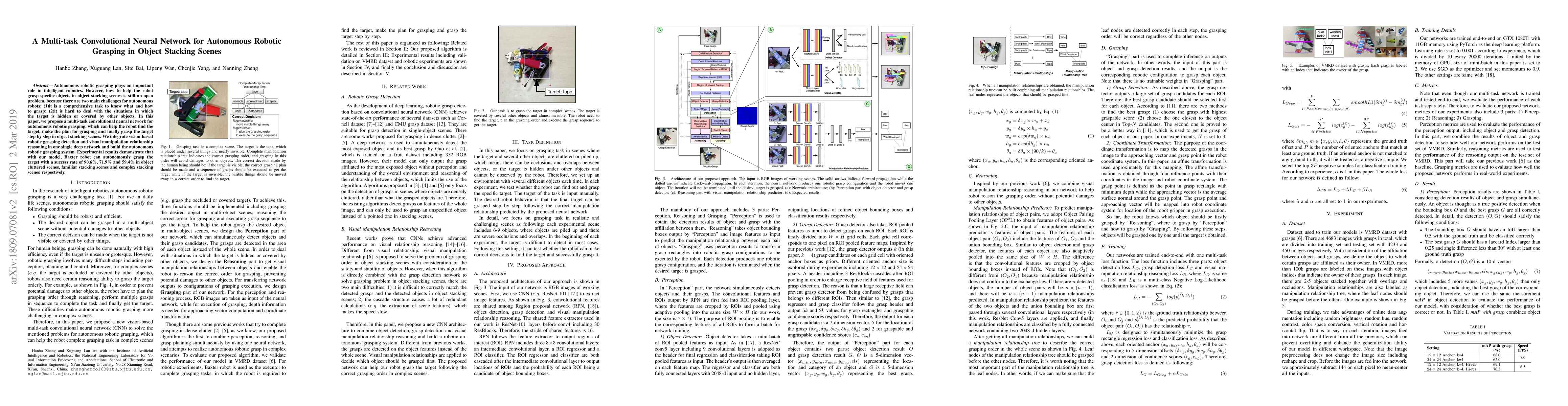The paper proposes a multi-task convolutional neural network for autonomous robotic grasping in object stacking scenes, integrating vision-based robotic grasping detection and visual manipulation relationship reasoning into a single deep network.
