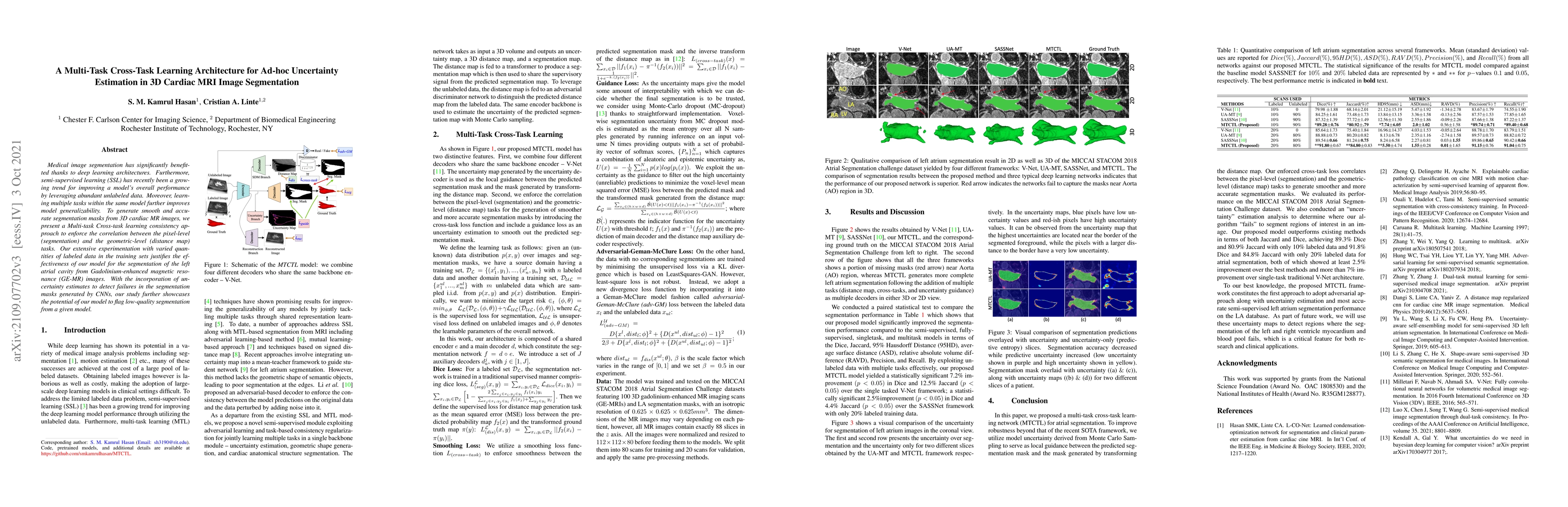 This paper proposes a multi-task cross-task learning architecture for improving accuracy and uncertainty estimation in 3D cardiac MRI image segmentation. The model outperforms existing methods with varied quantities of labeled data.