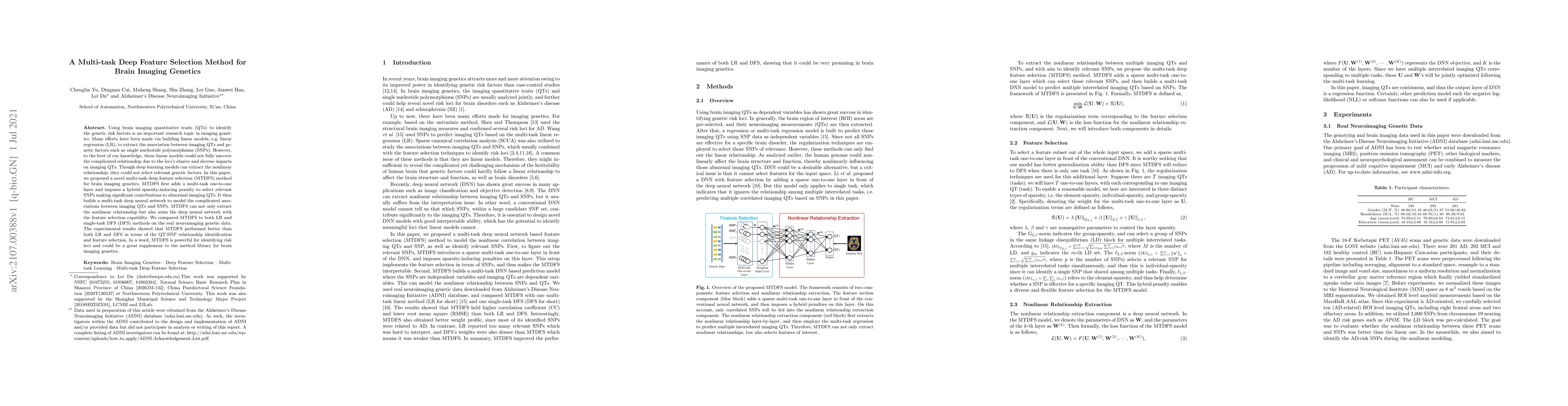 This paper introduces a novel multi-task deep feature selection (MTDFS) method to identify genetic risk factors associated with brain imaging quantitative traits (QTs). Unlike linear models, MTDFS leverages deep learning to capture complex, nonlinear relationships while incorporating feature selection to pinpoint relevant SNPs. Experimental results demonstrate MTDFS's superior performance over linear regression and single-task deep feature selection methods.