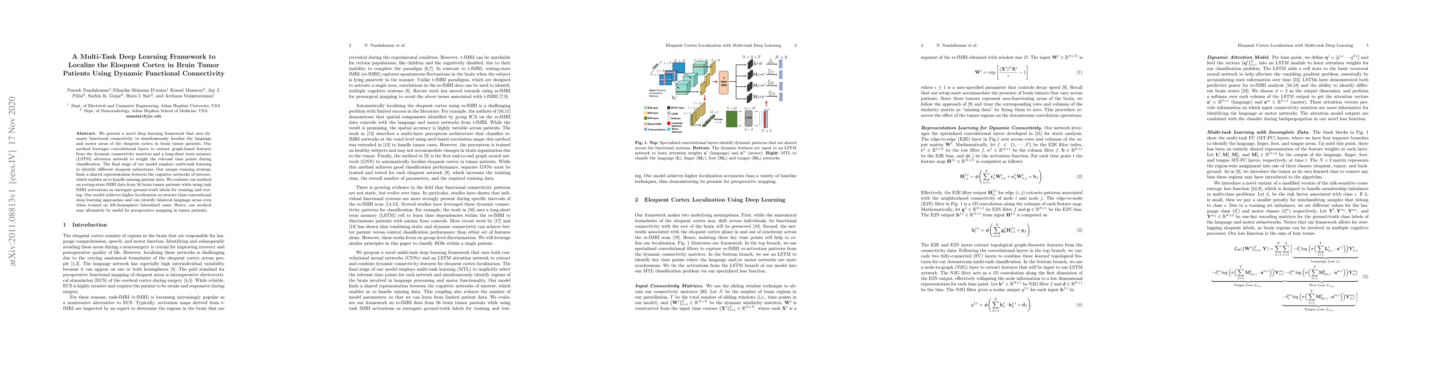 This paper introduces a deep learning framework that uses dynamic functional connectivity to localize language and motor areas in brain tumor patients. The model employs convolutional layers and an LSTM attention network, followed by multi-task learning to identify eloquent cortex regions, achieving higher accuracy than conventional methods.