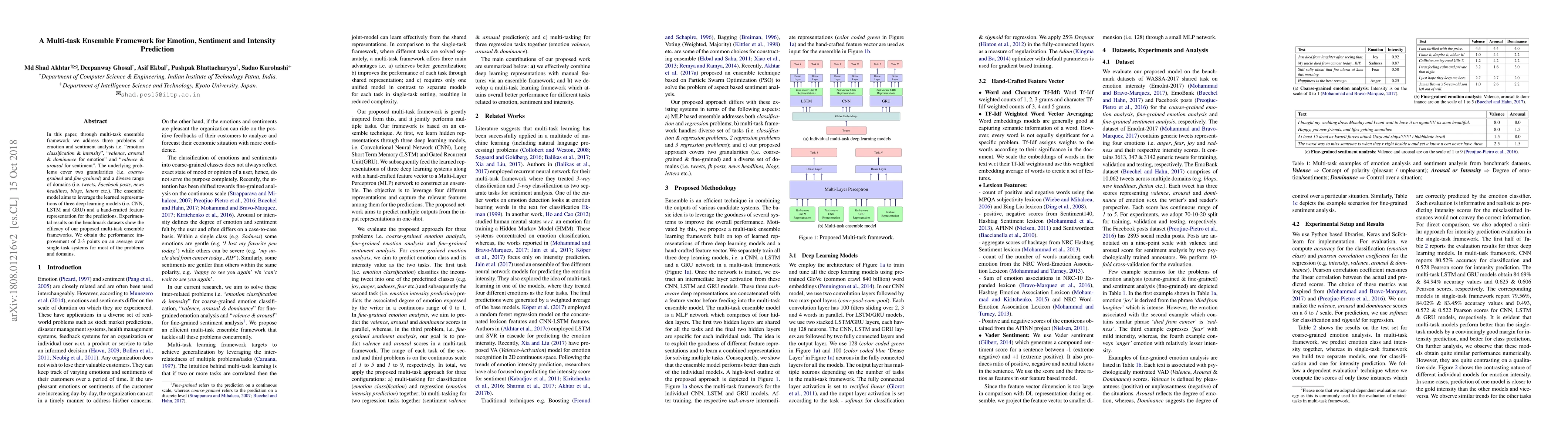 This paper proposes a multi-task ensemble framework to simultaneously predict emotion, sentiment, and intensity using deep learning models and hand-crafted features. The framework shows improved performance over single-task systems, achieving an average 2-3 point improvement across various datasets.