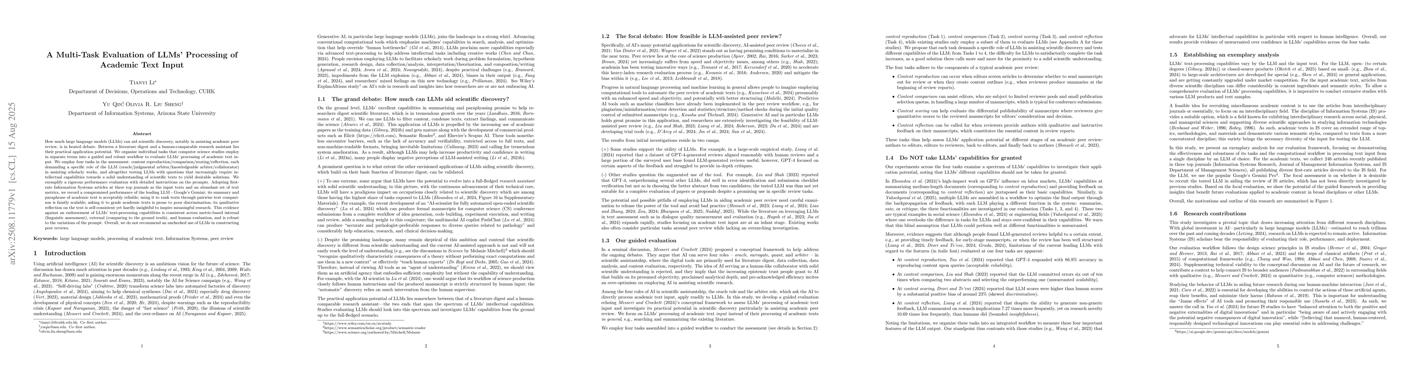 How much large language models (LLMs) can aid scientific discovery, notably in assisting academic peer review, is in heated debate. Between a literature digest and a human-comparable research assistant lies their practical application potential. We organize individual tasks that computer science studies employ in separate terms into a guided and robust workflow to evaluate LLMs' processing of academic text input. We employ four tasks in the assessment: content reproduction/comparison/scoring/reflection, each demanding a specific role of the LLM (oracle/judgmental arbiter/knowledgeable arbiter/collaborator) in assisting scholarly works, and altogether testing LLMs with questions that increasingly require intellectual capabilities towards a solid understanding of scientific texts to yield desirable solutions. We exemplify a rigorous performance evaluation with detailed instructions on the prompts. Adopting first-rate Information Systems articles at three top journals as the input texts and an abundant set of text metrics, we record a compromised performance of the leading LLM - Google's Gemini: its summary and paraphrase of academic text is acceptably reliable; using it to rank texts through pairwise text comparison is faintly scalable; asking it to grade academic texts is prone to poor discrimination; its qualitative reflection on the text is self-consistent yet hardly insightful to inspire meaningful research. This evidence against an endorsement of LLMs' text-processing capabilities is consistent across metric-based internal (linguistic assessment), external (comparing to the ground truth), and human evaluation, and is robust to the variations of the prompt. Overall, we do not recommend an unchecked use of LLMs in constructing peer reviews.