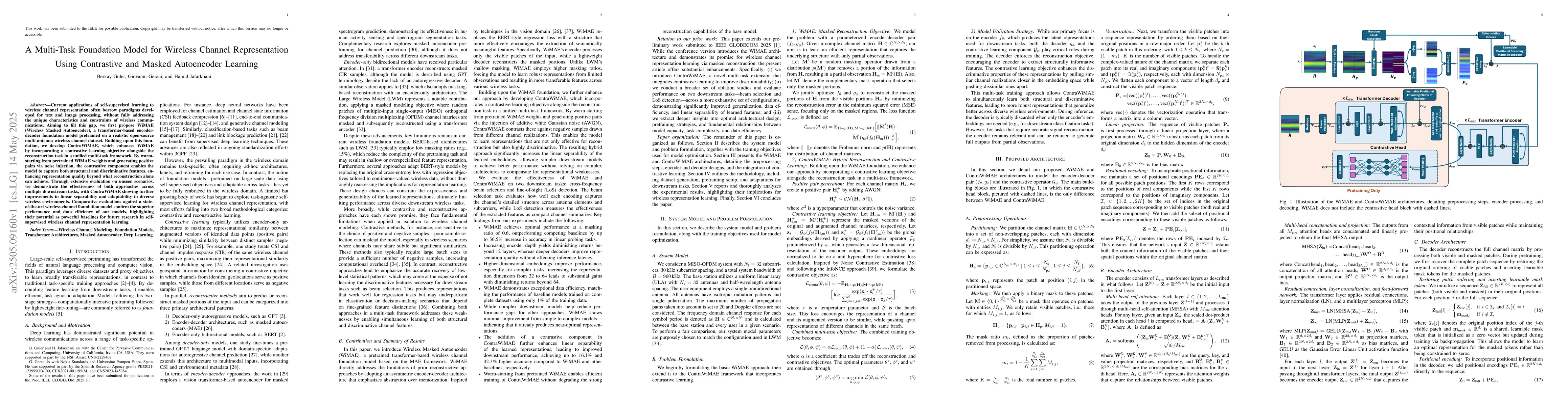 Current applications of self-supervised learning to wireless channel representation often borrow paradigms developed for text and image processing, without fully addressing the unique characteristics and constraints of wireless communications. Aiming to fill this gap, we first propose WiMAE (Wireless Masked Autoencoder), a transformer-based encoder-decoder foundation model pretrained on a realistic open-source multi-antenna wireless channel dataset. Building upon this foundation, we develop ContraWiMAE, which enhances WiMAE by incorporating a contrastive learning objective alongside the reconstruction task in a unified multi-task framework. By warm-starting from pretrained WiMAE weights and generating positive pairs via noise injection, the contrastive component enables the model to capture both structural and discriminative features, enhancing representation quality beyond what reconstruction alone can achieve. Through extensive evaluation on unseen scenarios, we demonstrate the effectiveness of both approaches across multiple downstream tasks, with ContraWiMAE showing further improvements in linear separability and adaptability in diverse wireless environments. Comparative evaluations against a state-of-the-art wireless channel foundation model confirm the superior performance and data efficiency of our models, highlighting their potential as powerful baselines for future research in self-supervised wireless channel representation learning.