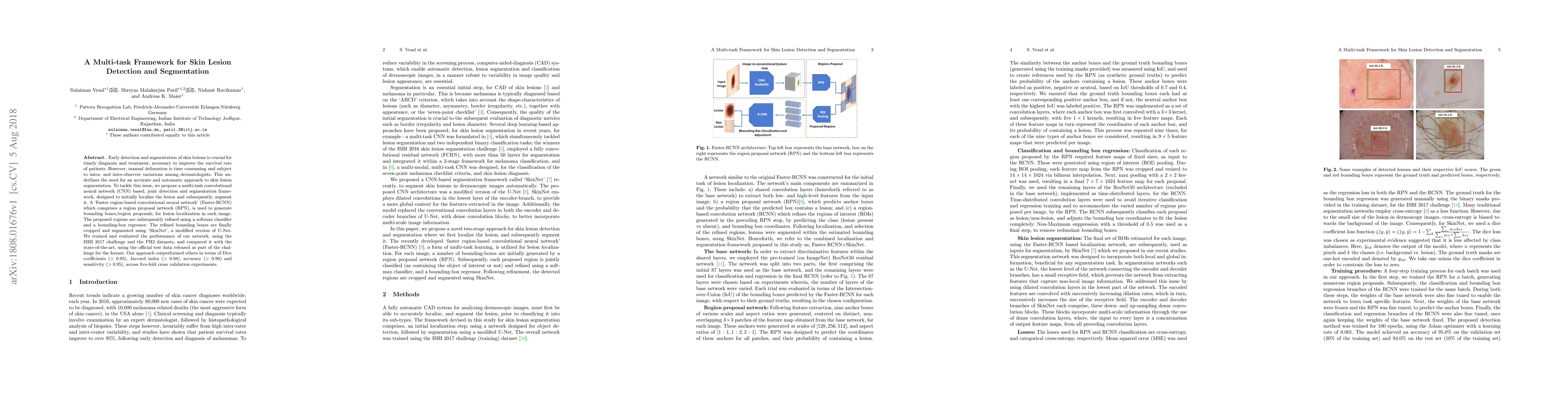 Early detection and segmentation of skin lesions is crucial for timely diagnosis and treatment, necessary to improve the survival rate of patients. However, manual delineation is time consuming and subject to intra- and inter-observer variations among dermatologists. This underlines the need for an accurate and automatic approach to skin lesion segmentation. To tackle this issue, we propose a multi-task convolutional neural network (CNN) based, joint detection and segmentation framework, designed to initially localize the lesion and subsequently, segment it. A `Faster region-based convolutional neural network' (Faster-RCNN) which comprises a region proposal network (RPN), is used to generate bounding boxes/region proposals, for lesion localization in each image. The proposed regions are subsequently refined using a softmax classifier and a bounding-box regressor. The refined bounding boxes are finally cropped and segmented using `SkinNet', a modified version of U-Net. We trained and evaluated the performance of our network, using the ISBI 2017 challenge and the PH2 datasets, and compared it with the state-of-the-art, using the official test data released as part of the challenge for the former. Our approach outperformed others in terms of Dice coefficients ($>0.93$), Jaccard index ($>0.88$), accuracy ($>0.96$) and sensitivity ($>0.95$), across five-fold cross validation experiments.