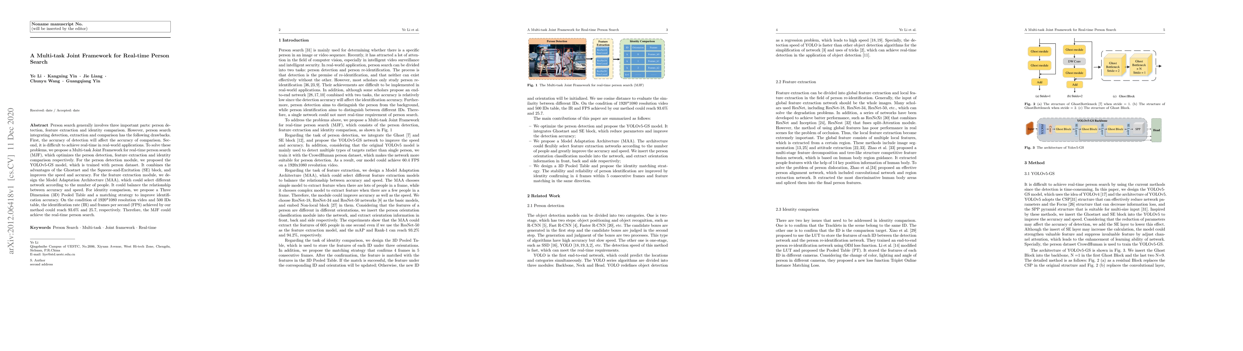 This paper proposes a Multi-task Joint Framework (MJF) for real-time person search, addressing accuracy and speed issues in person detection, feature extraction, and identity comparison. The YOLOv5-GS model enhances detection speed and accuracy, while the Model Adaptation Architecture (MAA) balances accuracy and speed in feature extraction, and a 3D Pooled Table improves identification accuracy.