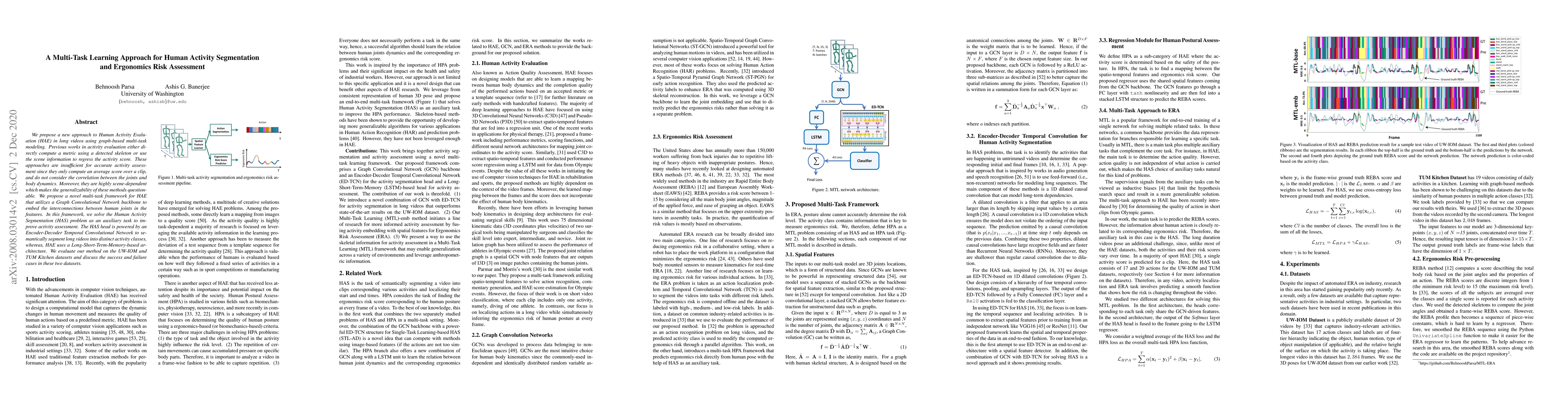 This paper proposes a multi-task learning framework using graph-based modeling to improve human activity evaluation in long videos, addressing limitations of previous scene-dependent approaches by embedding joint correlations and using a graph convolutional network for joint interconnections. The framework includes a segmentation task to enhance activity assessment.