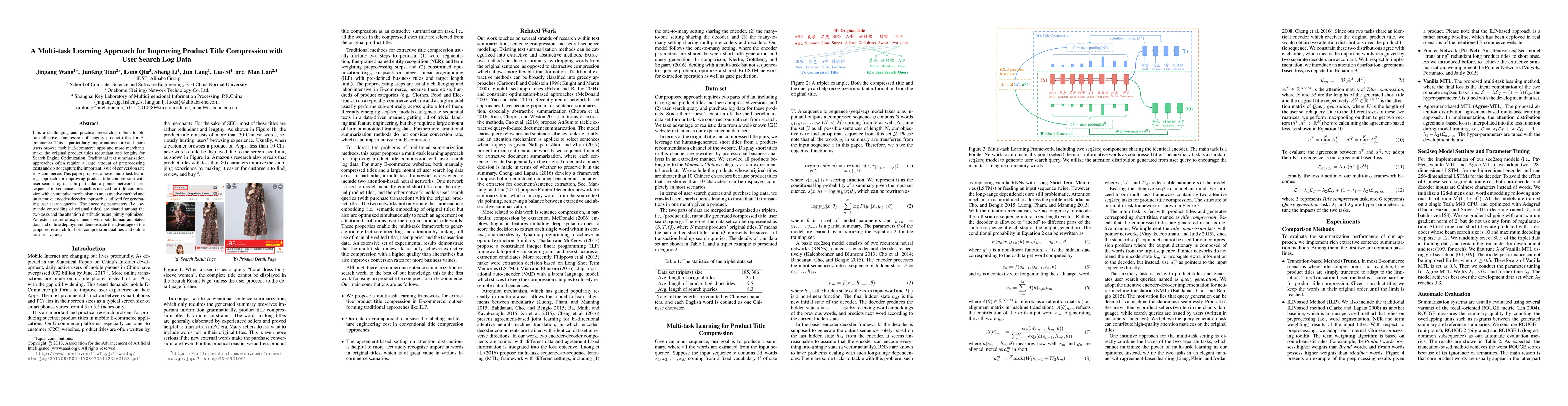 This paper proposes a multi-task learning approach to improve the compression of lengthy product titles using user search log data, employing a pointer network-based sequence-to-sequence model and an attentive encoder-decoder for generating search queries, showing improved compression quality and business value.