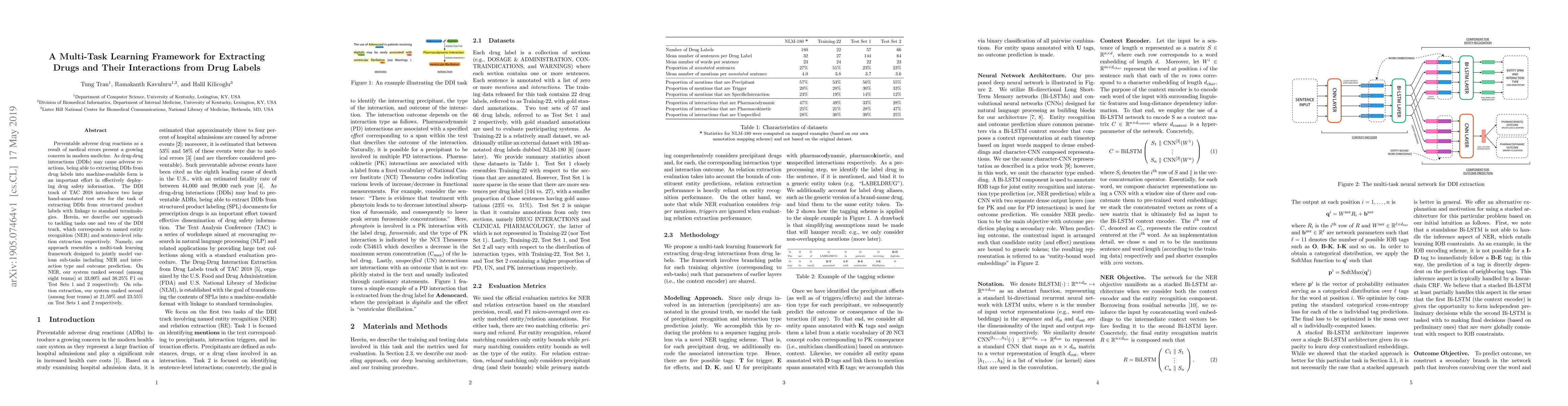 Preventable adverse drug reactions as a result of medical errors present a growing concern in modern medicine. As drug-drug interactions (DDIs) may cause adverse reactions, being able to extracting DDIs from drug labels into machine-readable form is an important effort in effectively deploying drug safety information. The DDI track of TAC 2018 introduces two large hand-annotated test sets for the task of extracting DDIs from structured product labels with linkage to standard terminologies. Herein, we describe our approach to tackling tasks one and two of the DDI track, which corresponds to named entity recognition (NER) and sentence-level relation extraction respectively. Namely, our approach resembles a multi-task learning framework designed to jointly model various sub-tasks including NER and interaction type and outcome prediction. On NER, our system ranked second (among eight teams) at 33.00% and 38.25% F1 on Test Sets 1 and 2 respectively. On relation extraction, our system ranked second (among four teams) at 21.59% and 23.55% on Test Sets 1 and 2 respectively.