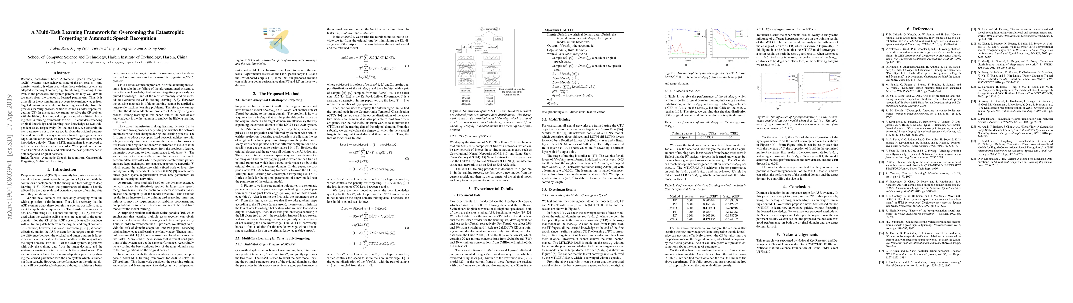 This paper proposes a multi-task learning framework to address catastrophic forgetting in Automatic Speech Recognition (ASR) systems. The framework balances learning new knowledge while preserving original knowledge, achieving better performance on both target and original datasets.
