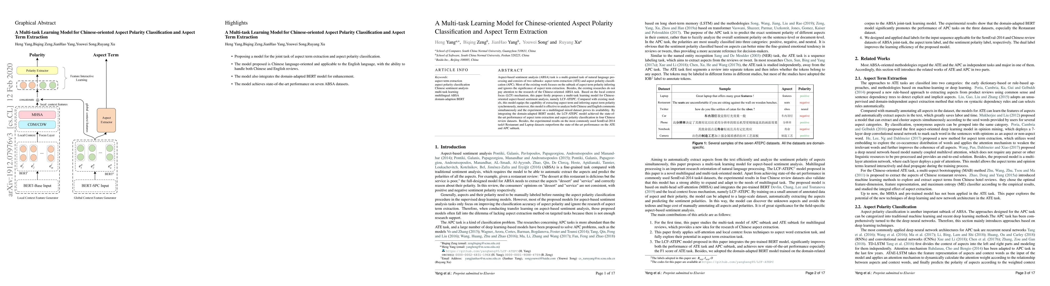 This paper proposes a multi-task learning model, LCF-ATEPC, for Chinese-oriented aspect-based sentiment analysis, which simultaneously extracts aspect terms and classifies their polarities. The model integrates a local context focus mechanism and domain-adapted BERT, achieving state-of-the-art performance on both Chinese and English datasets.