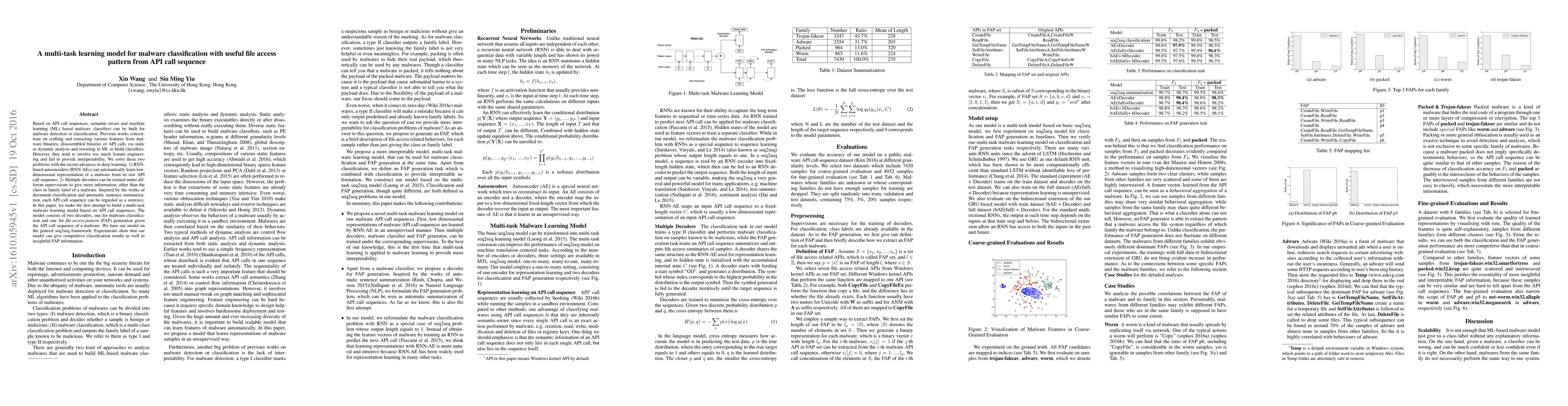 Based on API call sequences, semantic-aware and machine learning (ML) based malware classifiers can be built for malware detection or classification. Previous works concentrate on crafting and extracting various features from malware binaries, disassembled binaries or API calls via static or dynamic analysis and resorting to ML to build classifiers. However, they tend to involve too much feature engineering and fail to provide interpretability. We solve these two problems with the recent advances in deep learning: 1) RNN-based autoencoders (RNN-AEs) can automatically learn low-dimensional representation of a malware from its raw API call sequence. 2) Multiple decoders can be trained under different supervisions to give more information, other than the class or family label of a malware. Inspired by the works of document classification and automatic sentence summarization, each API call sequence can be regarded as a sentence. In this paper, we make the first attempt to build a multi-task malware learning model based on API call sequences. The model consists of two decoders, one for malware classification and one for $\emph{file access pattern}$ (FAP) generation given the API call sequence of a malware. We base our model on the general seq2seq framework. Experiments show that our model can give competitive classification results as well as insightful FAP information.