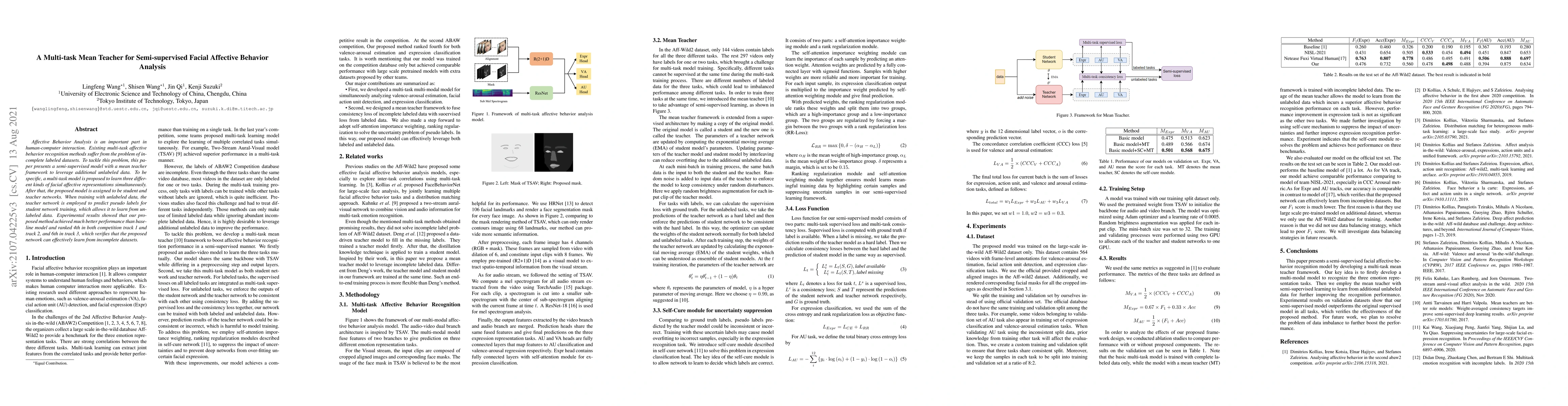 Affective Behavior Analysis is an important part in human-computer interaction. Existing multi-task affective behavior recognition methods suffer from the problem of incomplete labeled datasets. To tackle this problem, this paper presents a semi-supervised model with a mean teacher framework to leverage additional unlabeled data. To be specific, a multi-task model is proposed to learn three different kinds of facial affective representations simultaneously. After that, the proposed model is assigned to be student and teacher networks. When training with unlabeled data, the teacher network is employed to predict pseudo labels for student network training, which allows it to learn from unlabeled data. Experimental results showed that our proposed method achieved much better performance than baseline model and ranked 4th in both competition track 1 and track 2, and 6th in track 3, which verifies that the proposed network can effectively learn from incomplete datasets.