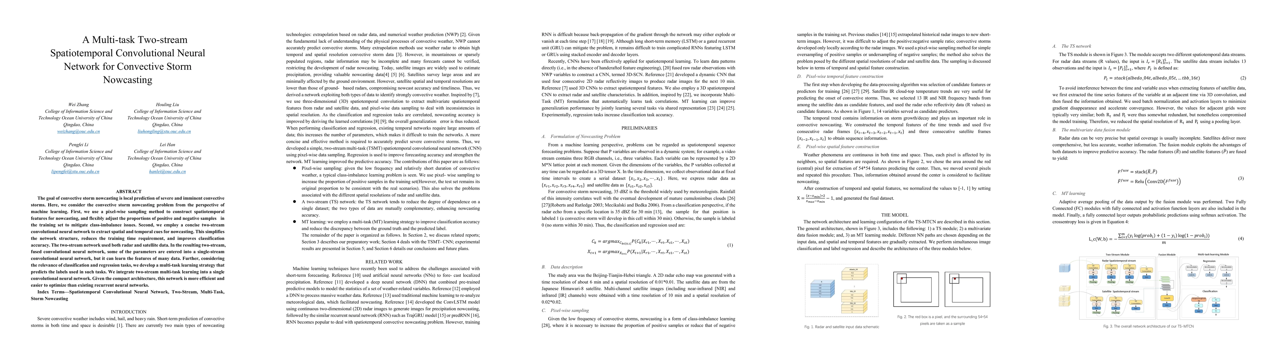 This paper proposes a multi-task two-stream convolutional neural network for convective storm nowcasting using radar and satellite data. It employs a two-stream architecture to extract spatial and temporal features, simplifies the network, and enhances classification accuracy through multi-task learning.