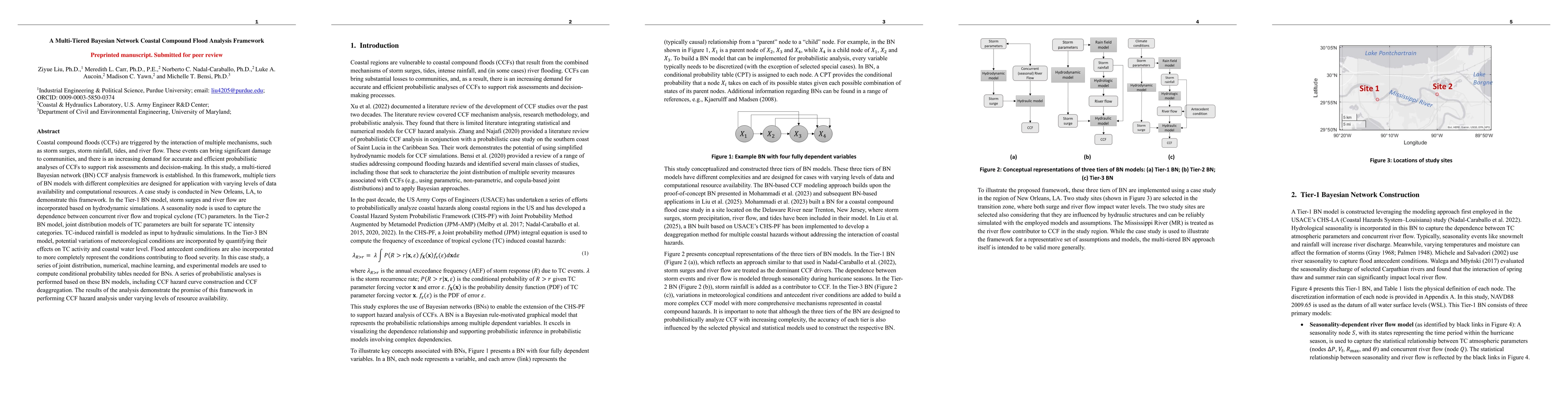 A multi-tiered Bayesian network (BN) framework is developed for coastal compound flood (CCF) analysis, incorporating varying levels of complexity and data requirements through Tier-1, Tier-2, and Tier-3 models. Hydrodynamic and hydraulic simulations, along with joint distribution, numerical, machine learning, and experimental models, are utilized to compute conditional probability tables for the BNs.