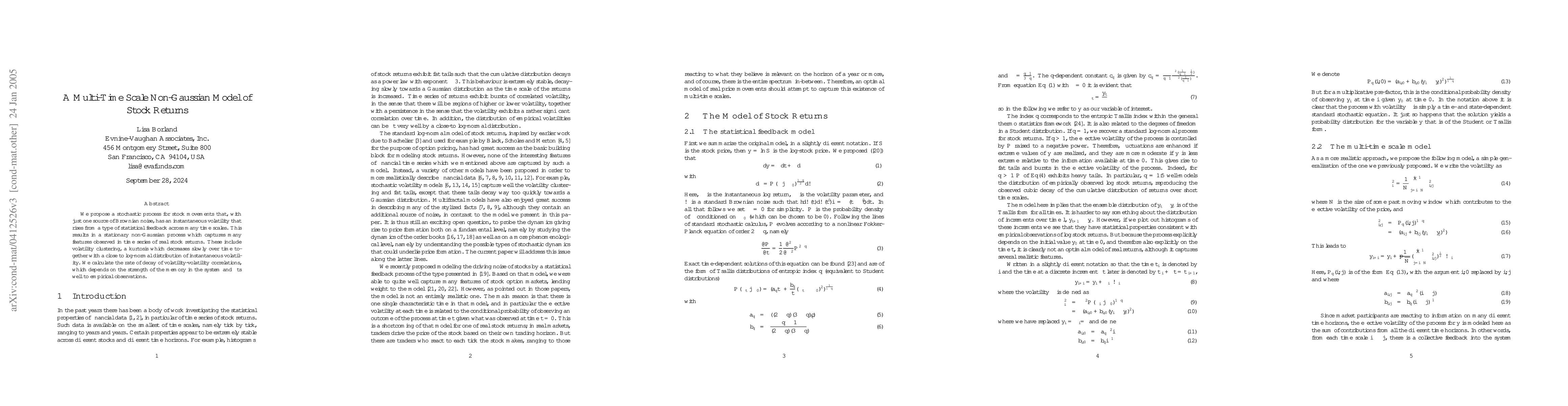 We propose a stochastic process for stock movements that, with just one source of Brownian noise, has an instantaneous volatility that rises from a type of statistical feedback across many time scales. This results in a stationary non-Gaussian process which captures many features observed in time series of real stock returns. These include volatility clustering, a kurtosis which decreases slowly over time together with a close to log-normal distribution of instantaneous volatility. We calculate the rate of decay of volatility-volatility correlations, which depends on the strength of the memory in the system and fits well to empirical observations.