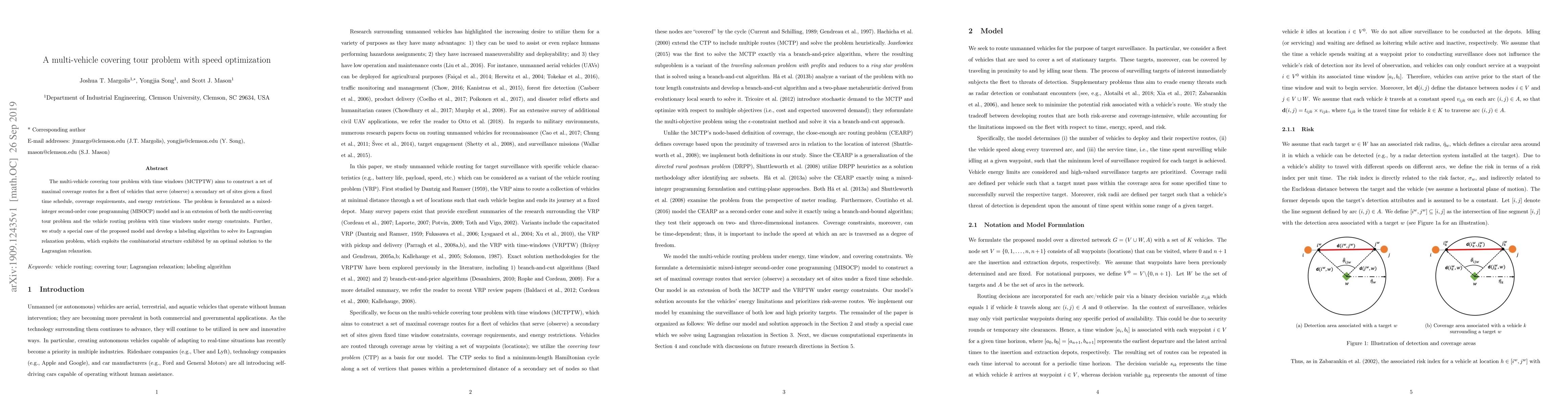 The paper addresses the multi-vehicle covering tour problem with time windows and energy constraints, formulating it as a mixed-integer second-order cone programming model. It develops a labeling algorithm for solving the Lagrangian relaxation of a special case, leveraging the problem's combinatorial structure.