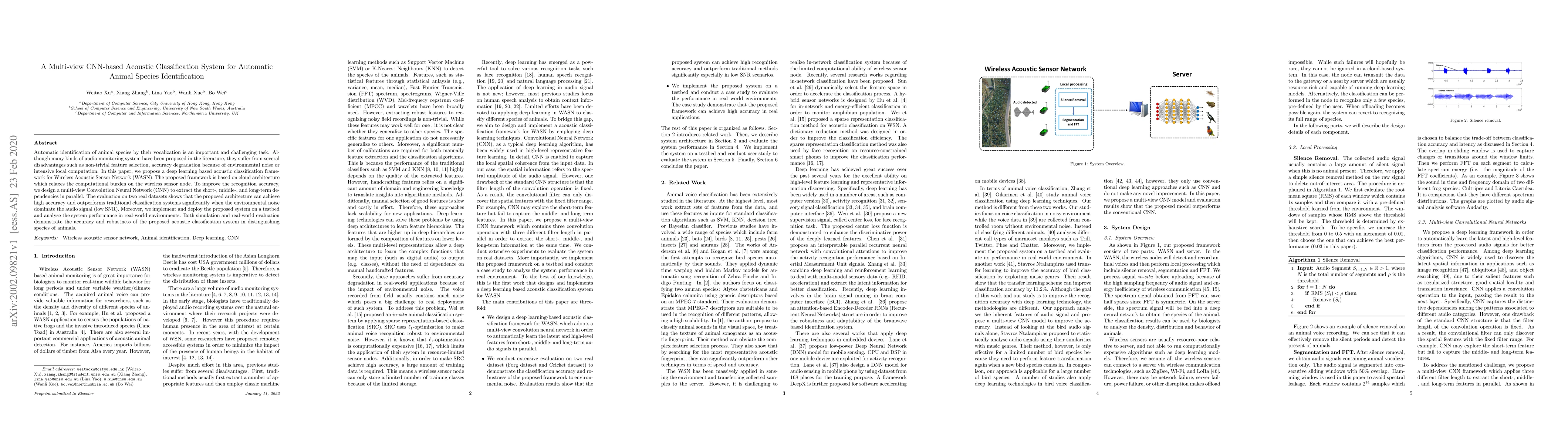 This research introduces a multi-view CNN-based framework for automatic animal species identification using acoustic classification in Wireless Acoustic Sensor Networks. The system employs parallel short-, middle-, and long-term dependency extraction to enhance recognition accuracy, especially under noisy conditions, and outperforms traditional methods, as demonstrated through real-world deployments and evaluations.