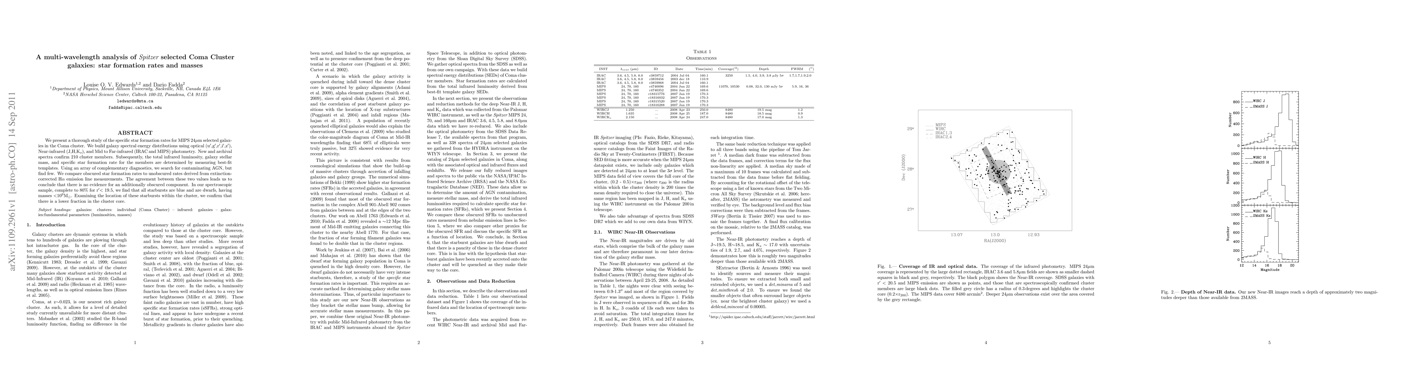 This study analyzes the star formation rates and masses of Spitzer-selected galaxies in the Coma Cluster using multi-wavelength data. It finds that starburst galaxies are predominantly blue dwarfs with masses below 10^9 solar masses, and there is no evidence for an additional obscured star formation component.