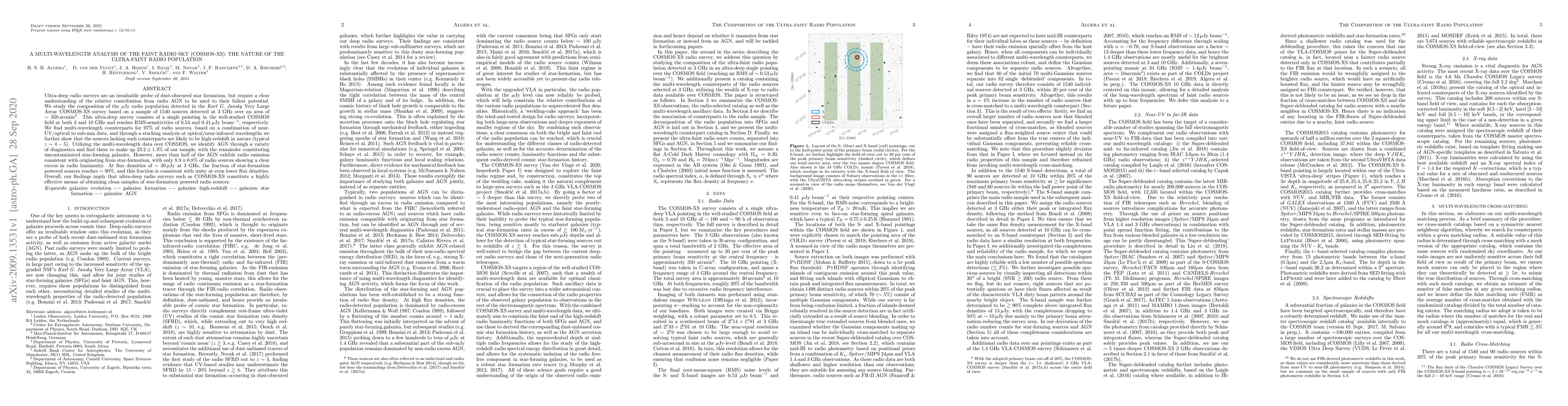 This study uses the COSMOS-XS survey to analyze the ultra-faint radio population, finding that 97% of $\mu$Jy radio sources have multi-wavelength counterparts, with AGN making up 23% of the sample. Most AGN show star-formation-driven radio emissions, indicating that ultra-deep radio surveys are effective for identifying star-forming galaxies.