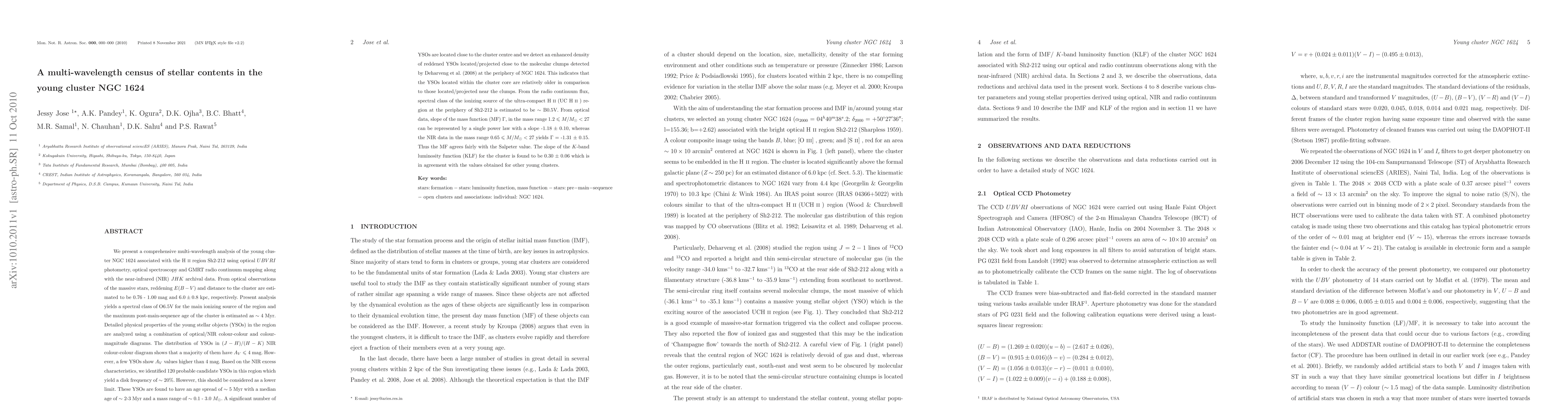 We present a comprehensive multi-wavelength analysis of the young cluster NGC 1624 associated with the H II region Sh2-212 using optical UBVRI photometry, optical spectroscopy and GMRT radio continuum mapping along with the near-infrared (NIR) JHK archival data. Reddening E(B-V) and distance to the cluster are estimated to be 0.76 - 1.00 mag and 6.0 +/- 0.8 kpc, respectively. Present analysis yields a spectral class of O6.5V for the main ionizing source of the region. The distribution of YSOs in (J-H)/ (H-K) NIR colour-colour diagram shows that a majority of them have A_V $\le$ 4 mag. Based on the NIR excess characteristics, we identified 120 probable candidate YSOs in this region which yield a disk frequency of ~ 20%. These YSOs are found to have an age spread of ~ 5 Myr with a median age of ~ 2-3 Myr and a mass range of ~ 0.1 - 3.0 $M_\odot$. A significant number of YSOs are located close to the cluster centre and we detect an enhanced density of reddened YSOs located/projected close to the molecular clumps at the periphery of NGC 1624. This indicates that the YSOs located within the cluster core are relatively older in comparison to those located/projected near the clumps. From the radio continuum flux, spectral class of the ionizing source of the ultra-compact H II region at the periphery of Sh2-212 is estimated to be ~ B0.5V. From optical data, slope of the mass function (MF) $\Gamma$, in the mass range $1.2 \le M/M_{\odot}<27$ can be represented by a single power law with a slope -1.18 +/- 0.10, whereas the NIR data in the mass range $0.65 \le M/M_{\odot}<27$ yields $\Gamma$ = -1.31 +/- 0.15. The slope of the K-band luminosity function (KLF) for the cluster is found to be 0.30 +/- 0.06 which is in agreement with the values obtained for other young clusters.