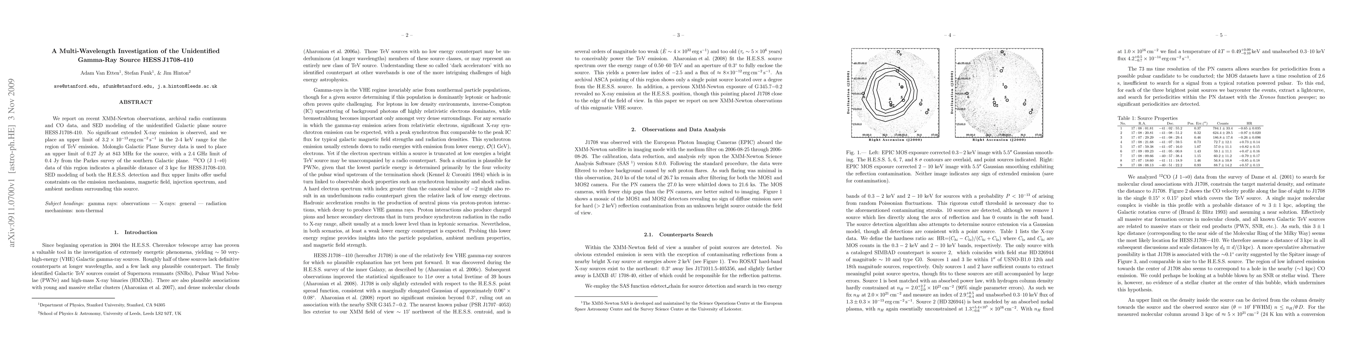 We report on recent XMM-Newton observations, archival radio continuum and CO data, and SED modeling of the unidentified Galactic plane source HESS J1708-410. No significant extended X-ray emission is observed, and we place an upper limit of 3.2 x 10{-13} erg cm{-2} s{-1} in the 2-4 keV range for the region of TeV emission. Molonglo Galactic Plane Survey data is used to place an upper limit of 0.27 Jy at 843 MHz for the source, with a 2.4 GHz limit of 0.4 Jy from the Parkes survey of the southern Galactic plane. 12CO (J 1->0) data of this region indicates a plausible distance of 3 kpc for HESS J1708-410. SED modeling of both the H.E.S.S. detection and flux upper limits offer useful constraints on the emission mechanisms, magnetic field, injection spectrum, and ambient medium surrounding this source.