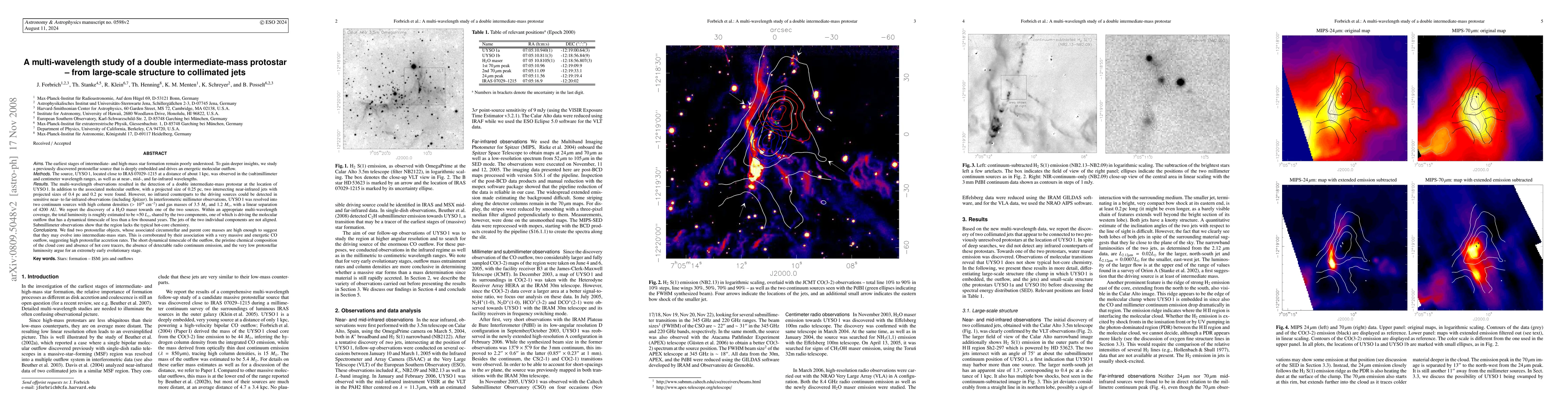 (abridged) We study a previously discovered protostellar source that is deeply embedded and drives an energetic molecular outflow. The source, UYSO1, is located close to IRAS 07029-1215 at a distance of ~1 kpc. The multi-wavelength observations resulted in the detection of a double intermediate-mass protostar at the location of UYSO1. In addition to the associated molecular outflow, with a projected size of 0.25 pc, two intersecting near-infrared jets with projected sizes of 0.4 pc and 0.2 pc were found. However, no infrared counterparts to the driving sources could be detected in sensitive near- to far-infrared observations. In interferometric millimeter observations, UYSO1 was resolved into two continuum sources with high column densities and gas masses of 3.5 Mo and 1.2 Mo, with a linear separation of 4200 AU. We report the discovery of a H2O maser toward one of the two sources. The total luminosity is roughly estimated to be ~50 Lo, shared by the two components, one of which is driving the molecular outflow that has a dynamical timescale of less than a few thousand years. The jets of the two individual components are not aligned. Submillimeter observations show that the region lacks typical hot-core chemistry. We thus find two protostellar objects, whose associated circumstellar and parent core masses are high enough to suggest that they may evolve into intermediate-mass stars. This is corroborated by their association with a very massive and energetic CO outflow, suggesting high protostellar accretion rates. The short dynamical timescale of the outflow, the pristine chemical composition of the cloud core and absence of hot core tracers, the absence of detectable radio continuum emission, and the very low protostellar luminosity argue for an extremely early evolutionary stage.