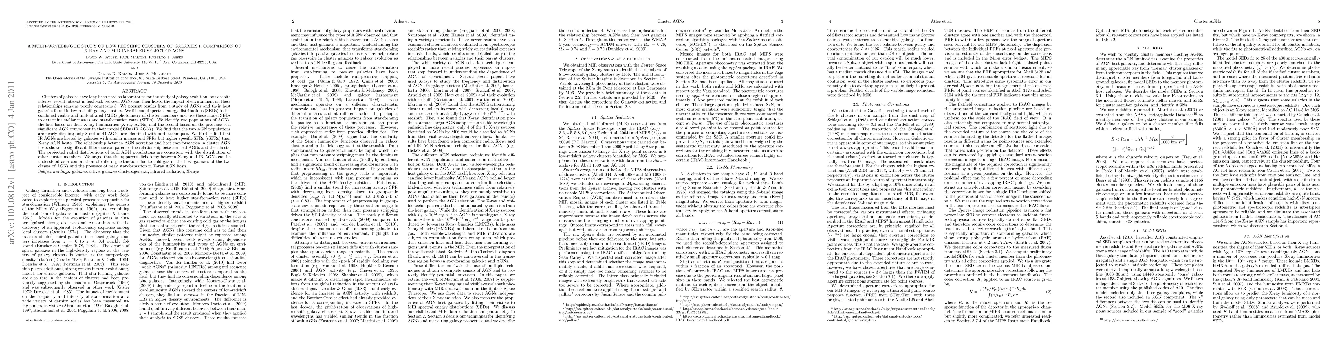 Clusters of galaxies have long been used as laboratories for the study of galaxy evolution, but despite intense, recent interest in feedback between AGNs and their hosts, the impact of environment on these relationships remains poorly constrained. We present results from a study of AGNs and their host galaxies found in low-redshift galaxy clusters. We fit model spectral energy distributions (SEDs) to the combined visible and mid-infrared (MIR) photometry of cluster members and use these model SEDs to determine stellar masses and star-formation rates (SFRs). We identify two populations of AGNs, the first based on their X-ray luminosities (X-ray AGNs) and the second based on the presence of a significant AGN component in their model SEDs (IR AGNs). We find that the two AGN populations are nearly disjoint; only 8 out of 44 AGNs are identified with both techniques. We further find that IR AGNs are hosted by galaxies with similar masses and SFRs but higher specific SFRs (sSFRs) than X-ray AGN hosts. The relationship between AGN accretion and host star-formation in cluster AGN hosts shows no significant difference compared to the relationship between field AGNs and their hosts. The projected radial distributions of both AGN populations are consistent with the distribution of other cluster members. We argue that the apparent dichotomy between X-ray and IR AGNs can be understood as a combination of differing extinction due to cold gas in the host galaxies of the two classes of AGNs and the presence of weak star-formation in X-ray AGN hosts.