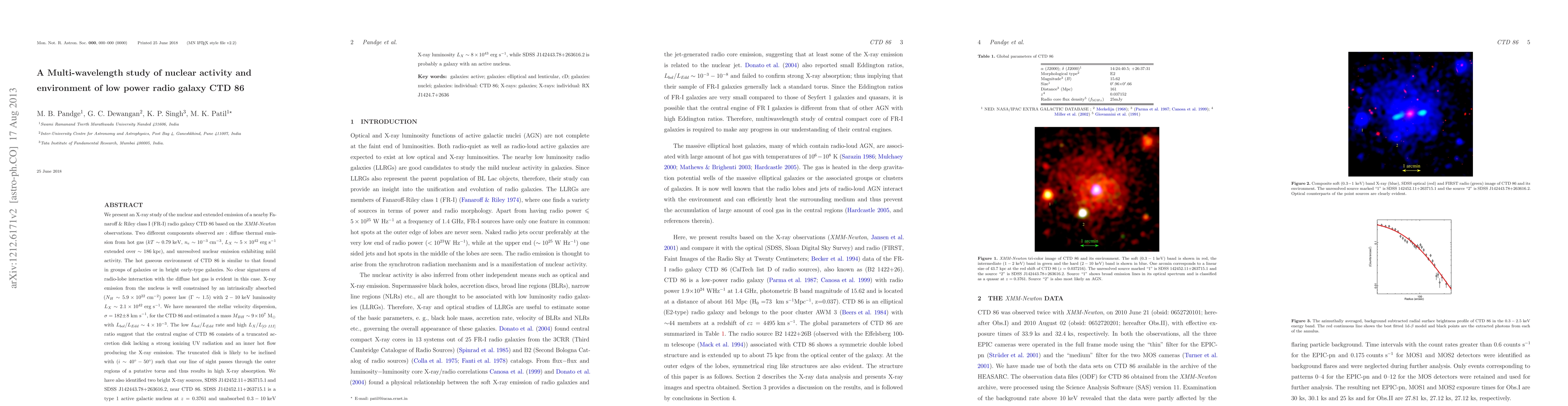 We present an X-ray study of the nuclear and extended emission of a nearby Fanaroff & Riley class I (FR-I) radio galaxy CTD 86 based on the \xmm{} observations. Two different components observed are : diffuse thermal emission from hot gas ($kT\sim 0.79\kev$, $n_e\sim 10^{-3}{\rm cm^{-3}}$, $L_X \sim 5\times10^{42}{\rm erg s^{-1}}$ extended over $\sim 186{\rm kpc}$), and unresolved nuclear emission exhibiting mild activity. The hot gaseous environment of CTD 86 is similar to that found in groups of galaxies or in bright early-type galaxies. No clear signatures of radio-lobe interaction with the diffuse hot gas is evident in this case. X-ray emission from the nucleus is well constrained by an intrinsically absorbed ($N_H \sim 5.9\times10^{22}{\rm cm^{-2}}$) power law ($\Gamma \sim 1.5$) with $2-10\kev$ luminosity $L_X \sim 2.1\times10^{42}{\rm erg s^{-1}}$. We have measured the stellar velocity dispersion, $\sigma=182\pm8\kms$, for the CTD 86 and estimated a mass $M_{BH}\sim 9\times 10^7{\rm M_\odot}$ with $L_{bol}/L_{Edd} \sim 4\times10^{-3}$. The low $L_{bol}/L_{Edd}$ rate and high $L_X/L_{[O III]}$ ratio suggest that the central engine of CTD 86 consists of a truncated accretion disk lacking a strong ionizing UV radiation and an inner hot flow producing the X-ray emission. The truncated disk is likely to be inclined with ($i\sim40^\circ-50^\circ$) such that our line of sight passes through the outer regions of a putative torus and thus results in high X-ray absorption. We have also identified two bright X-ray sources, SDSS J142452.11+263715.1 and SDSS J142443.78+263616.2, near CTD 86. SDSS J142452.11+263715.1 is a type 1 active galactic nucleus at $z=0.3761$ and unabsorbed $0.3-10\kev$ X-ray luminosity $L_X\sim 8 \times 10^{43}{\rm erg s^{-1}}$, while SDSS J142443.78+263616.2 is probably a galaxy with an active nucleus.