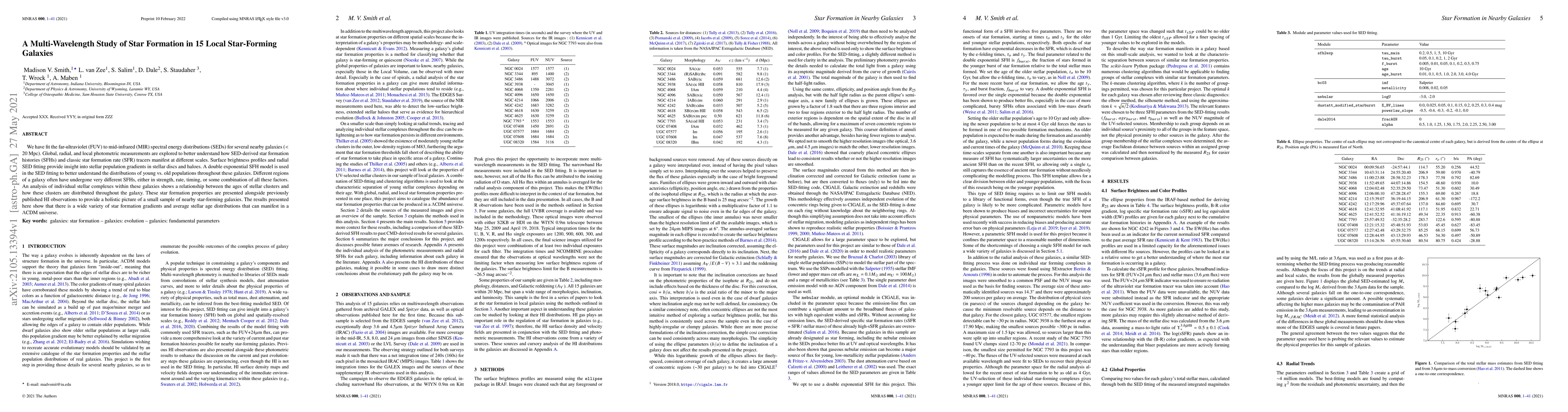 We have fit the far-ultraviolet (FUV) to mid-infrared (MIR) spectral energy distributions (SEDs) for several nearby galaxies ($<$ 20 Mpc). Global, radial, and local photometric measurements are explored to better understand how SED-derived star formation histories (SFHs) and classic star formation rate (SFR) tracers manifest at different scales. Surface brightness profiles and radial SED fitting provide insight into stellar population gradients in stellar discs and haloes. A double exponential SFH model is used in the SED fitting to better understand the distributions of young vs. old populations throughout these galaxies. Different regions of a galaxy often have undergone very different SFHs, either in strength, rate, timing, or some combination of all these factors. An analysis of individual stellar complexes within these galaxies shows a relationship between the ages of stellar clusters and how these clusters are distributed throughout the galaxy. These star formation properties are presented alongside previously published HI observations to provide a holistic picture of a small sample of nearby star-forming galaxies. The results presented here show that there is a wide variety of star formation gradients and average stellar age distributions that can manifest in a $\Lambda$CDM universe.