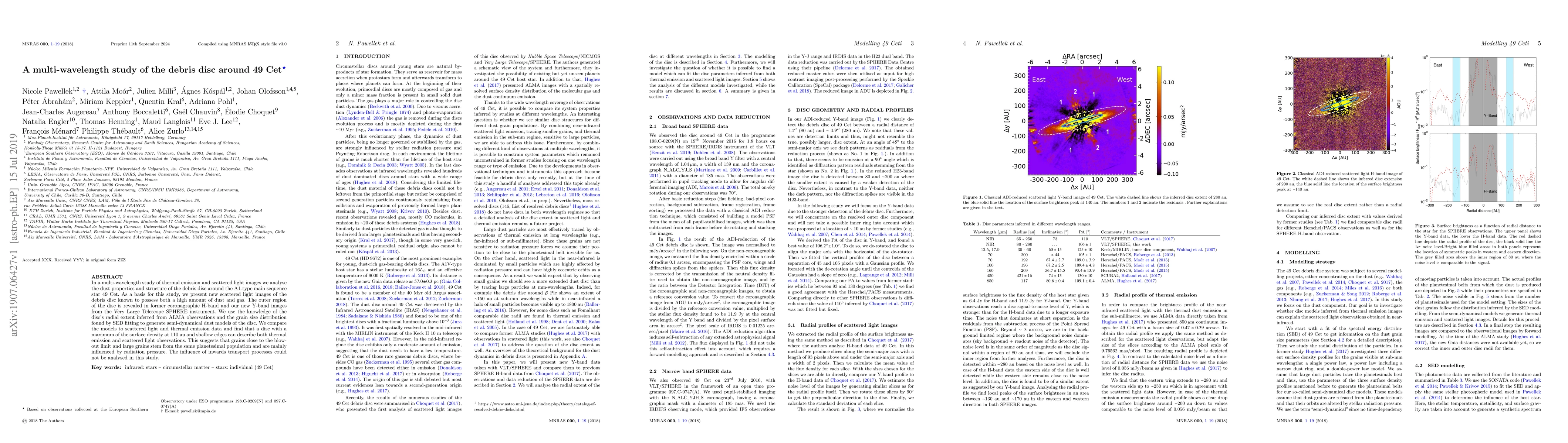 This study uses multi-wavelength observations to analyze the debris disc around the star 49 Cet, revealing a disc with a maximum surface density at 110 au and shallow edges, suggesting that grains near the blow-out limit and large grains are influenced by radiation pressure from the same planetesimal population. The influence of inwards transport processes remains unanalyzed.