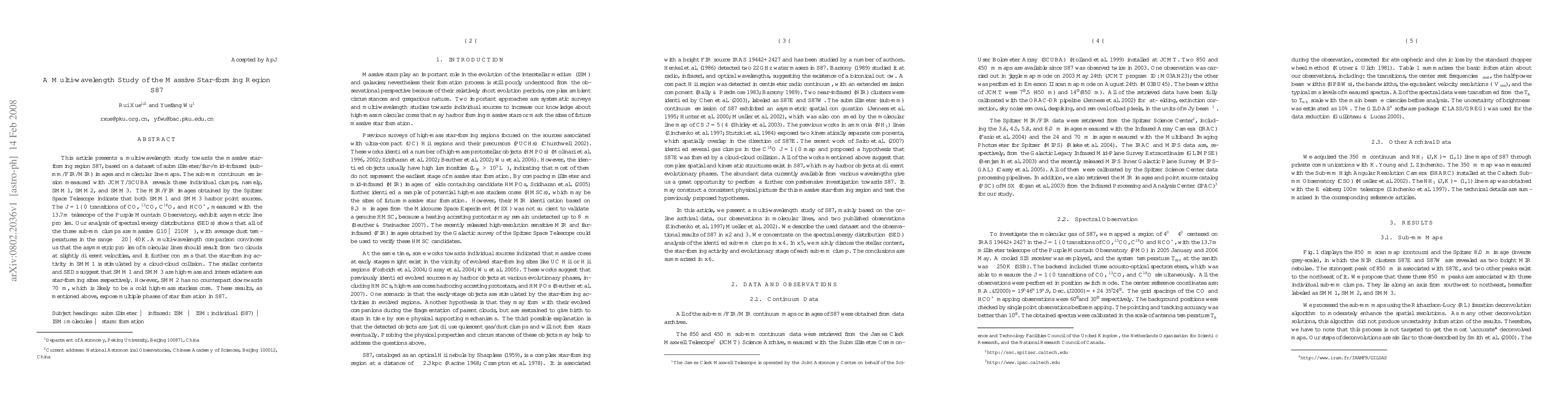 This article presents a multi-wavelength study towards S87, based on a dataset of submillimeter/far-/mid-infrared (sub-mm/FIR/MIR) images and molecular line maps. The sub-mm continuum emission measured with JCMT/SCUBA reveals three individual clumps, namely, SMM1, SMM2, and SMM3. The MIR/FIR images obtained by the Spitzer Space Telescope indicate that both SMM1 and SMM3 harbor point sources. The J=1-0 transitions of CO, 13CO, C18O, and HCO+, measured with the 13.7m telescope of the Purple Mountain Observatory, exhibit asymmetric line profiles. Our analysis of spectral energy distributions (SEDs) shows that all of the three sub-mm clumps are massive (110--210 $M_{\odot}$), with average dust temperatures in the range ~20--40K. A multi-wavelength comparison convinces us that the asymmetric profiles of molecular lines should result from two clouds at slightly different velocities, and it further confirms that the star-forming activity in SMM1 is stimulated by a cloud-cloud collision. The stellar contents and SEDs suggest that SMM1 and SMM3 are high-mass and intermediate-mass star-forming sites respectively. However, SMM2 has no counterpart downwards 70 micron, which is likely to be a cold high-mass starless core. These results, as mentioned above, expose multiple phases of star formation in S87.
