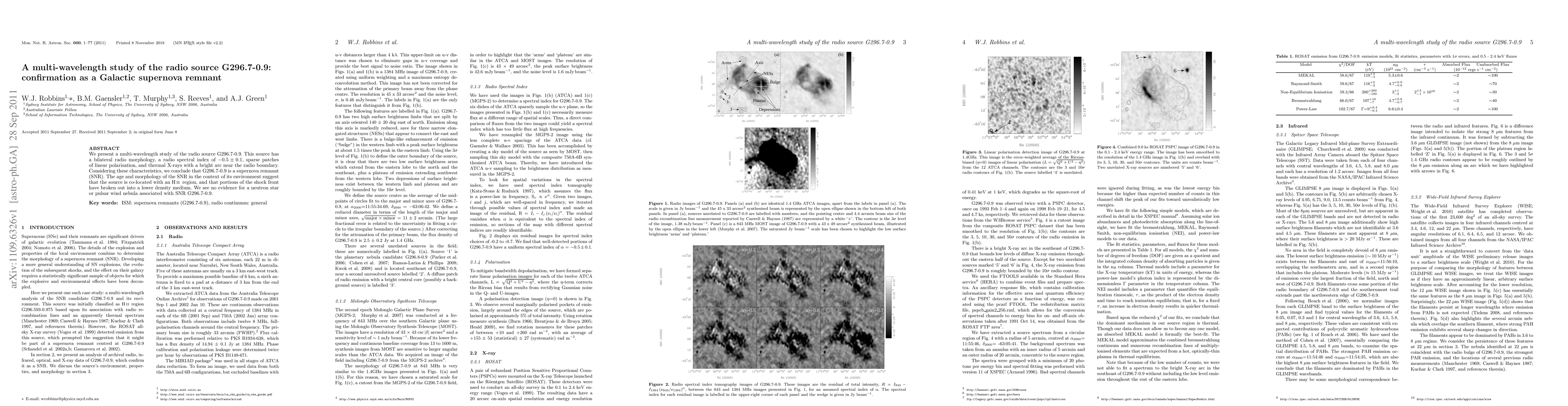 We present a multi-wavelength study of the radio source G296.7-0.9. This source has a bilateral radio morphology, a radio spectral index of -0.5 +/- 0.1, sparse patches of linear polarisation, and thermal X-rays with a bright arc near the radio boundary. Considering these characteristics, we conclude that G296.7-0.9 is a supernova remnant (SNR). The age and morphology of the SNR in the context of its environment suggest that the source is co-located with an HII region, and that portions of the shock front have broken out into a lower density medium. We see no evidence for a neutron star or pulsar wind nebula associated with SNR G296.7-0.9.