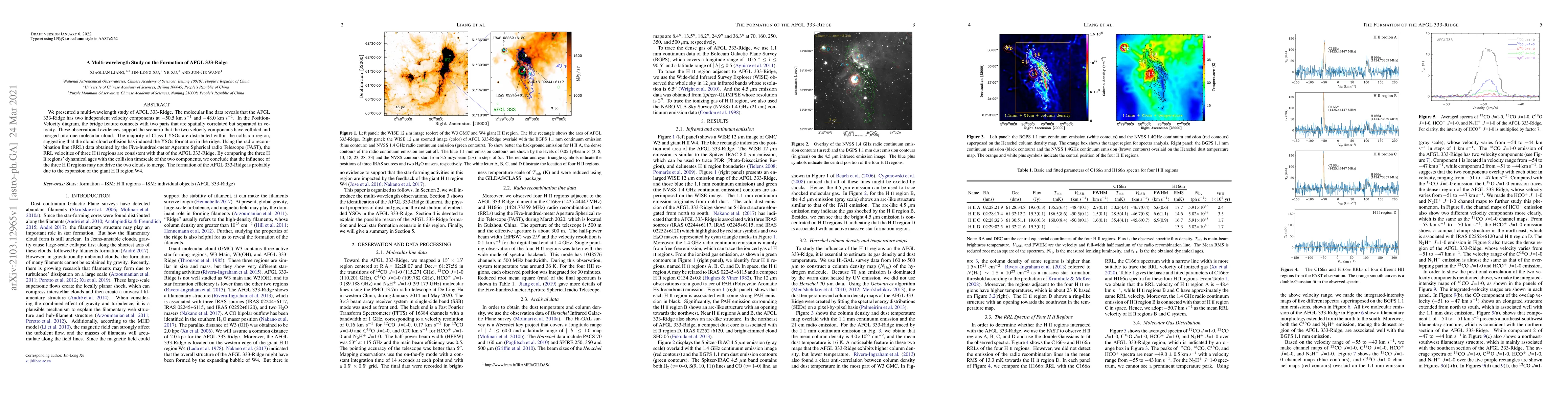 We presented a multi-wavelength study of AFGL 333-Ridge. The molecular line data reveals that the AFGL 333-Ridge has two independent velocity components at -50.5 km/s and -48.0 km/s. In the Position-Velocity diagram, the bridge feature connects with two parts that are spatially correlated but separated in velocity. These observational evidences support the scenario that the two velocity components have collided and merged into one molecular cloud. The majority of Class I YSOs are distributed within the collision region, suggesting that the cloud-cloud collision has induced the YSOs formation in the ridge. Using the radio recombination line (RRL) data obtained by the Five-hundred-meter Aperture Spherical radio Telescope (FAST), the RRL velocities of three HII regions are consistent with that of the AFGL 333-Ridge. By comparing the three HII regions' dynamical ages with the collision timescale of the two components, we conclude that the influence of the three HII regions may not drive the two clouds to merge. The formation of the AFGL 333-Ridge is probably due to the expansion of the giant HII region W4.