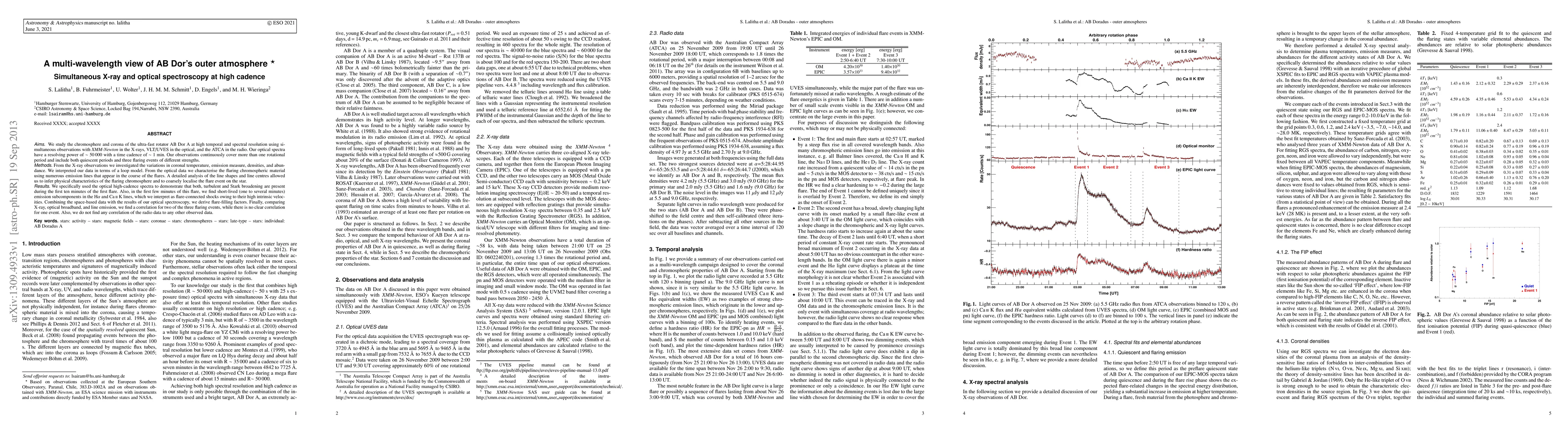 We study the chromosphere and corona of the ultra-fast rotator AB Dor A at high temporal and spectral resolution using simultaneous observations with XMM-Newton in the X-rays, VLT/UVES in the optical, and the ATCA in the radio. Our optical spectra have a resolving power of ~50 000 with a time cadence of ~1 min. Our observations continuously cover more than one rotational period and include both quiescent periods and three flaring events of different strengths. From the X-ray observations we investigated the variations in coronal temperature, emission measure, densities, and abundance. We interpreted our data in terms of a loop model. From the optical data we characterise the flaring chromospheric material using numerous emission lines that appear in the course of the flares. A detailed analysis of the line shapes and line centres allowed us to infer physical characteristics of the flaring chromosphere and to coarsely localise the flare event on the star. We specifically used the optical high-cadence spectra to demonstrate that both, turbulent and Stark broadening are present during the first ten minutes of the first flare. Also, in the first few minutes of this flare, we find short-lived (one to several minutes) emission subcomponents in the H{\alpha} and Ca ii K lines, which we interpret as flare-connected shocks owing to their high intrinsic velocities. Combining the space-based data with the results of our optical spectroscopy, we derive flare-filling factors. Finally, comparing X-ray, optical broadband, and line emission, we find a correlation for two of the three flaring events, while there is no clear correlation for one event. Also, we do not find any correlation of the radio data to any other observed data.