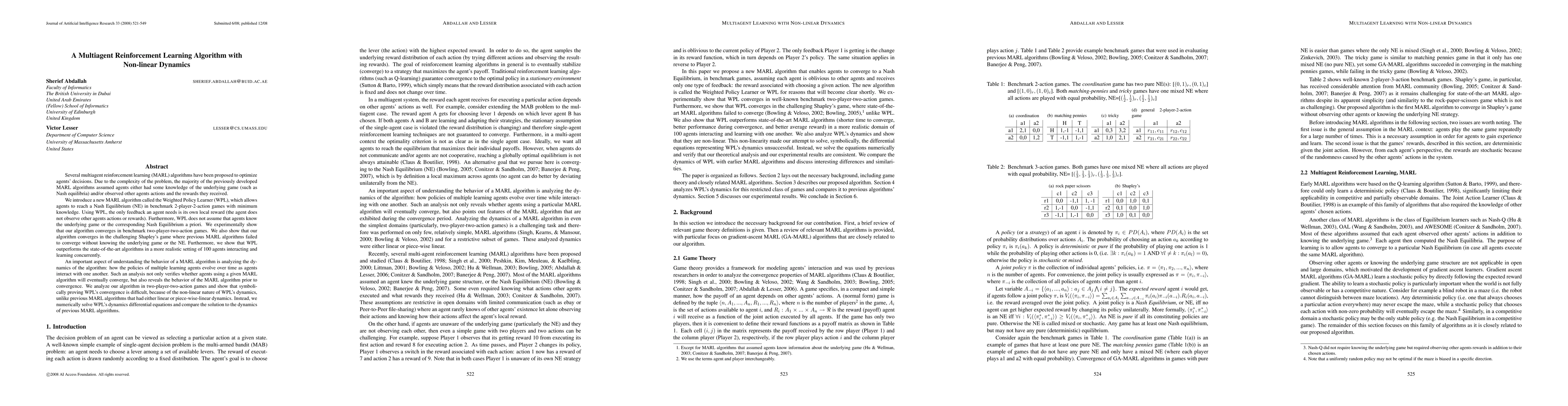 Several multiagent reinforcement learning (MARL) algorithms have been proposed to optimize agents decisions. Due to the complexity of the problem, the majority of the previously developed MARL algorithms assumed agents either had some knowledge of the underlying game (such as Nash equilibria) and/or observed other agents actions and the rewards they received. We introduce a new MARL algorithm called the Weighted Policy Learner (WPL), which allows agents to reach a Nash Equilibrium (NE) in benchmark 2-player-2-action games with minimum knowledge. Using WPL, the only feedback an agent needs is its own local reward (the agent does not observe other agents actions or rewards). Furthermore, WPL does not assume that agents know the underlying game or the corresponding Nash Equilibrium a priori. We experimentally show that our algorithm converges in benchmark two-player-two-action games. We also show that our algorithm converges in the challenging Shapleys game where previous MARL algorithms failed to converge without knowing the underlying game or the NE. Furthermore, we show that WPL outperforms the state-of-the-art algorithms in a more realistic setting of 100 agents interacting and learning concurrently. An important aspect of understanding the behavior of a MARL algorithm is analyzing the dynamics of the algorithm: how the policies of multiple learning agents evolve over time as agents interact with one another. Such an analysis not only verifies whether agents using a given MARL algorithm will eventually converge, but also reveals the behavior of the MARL algorithm prior to convergence. We analyze our algorithm in two-player-two-action games and show that symbolically proving WPLs convergence is difficult, because of the non-linear nature of WPLs dynamics, unlike previous MARL algorithms that had either linear or piece-wise-linear dynamics. Instead, we numerically solve WPLs dynamics differential equations and compare the solution to the dynamics of previous MARL algorithms.