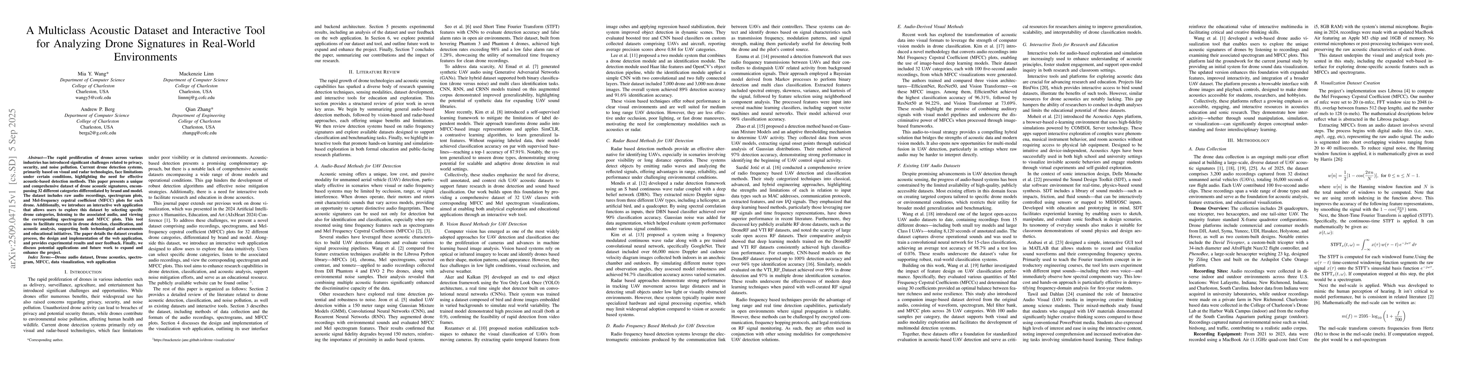 The rapid proliferation of drones across various industries has introduced significant challenges related to privacy, security, and noise pollution. Current drone detection systems, primarily based on visual and radar technologies, face limitations under certain conditions, highlighting the need for effective acoustic-based detection methods. This paper presents a unique and comprehensive dataset of drone acoustic signatures, encompassing 32 different categories differentiated by brand and model. The dataset includes raw audio recordings, spectrogram plots, and Mel-frequency cepstral coefficient (MFCC) plots for each drone. Additionally, we introduce an interactive web application that allows users to explore this dataset by selecting specific drone categories, listening to the associated audio, and viewing the corresponding spectrogram and MFCC plots. This tool aims to facilitate research in drone detection, classification, and acoustic analysis, supporting both technological advancements and educational initiatives. The paper details the dataset creation process, the design and implementation of the web application, and provides experimental results and user feedback. Finally, we discuss potential applications and future work to expand and enhance the project.