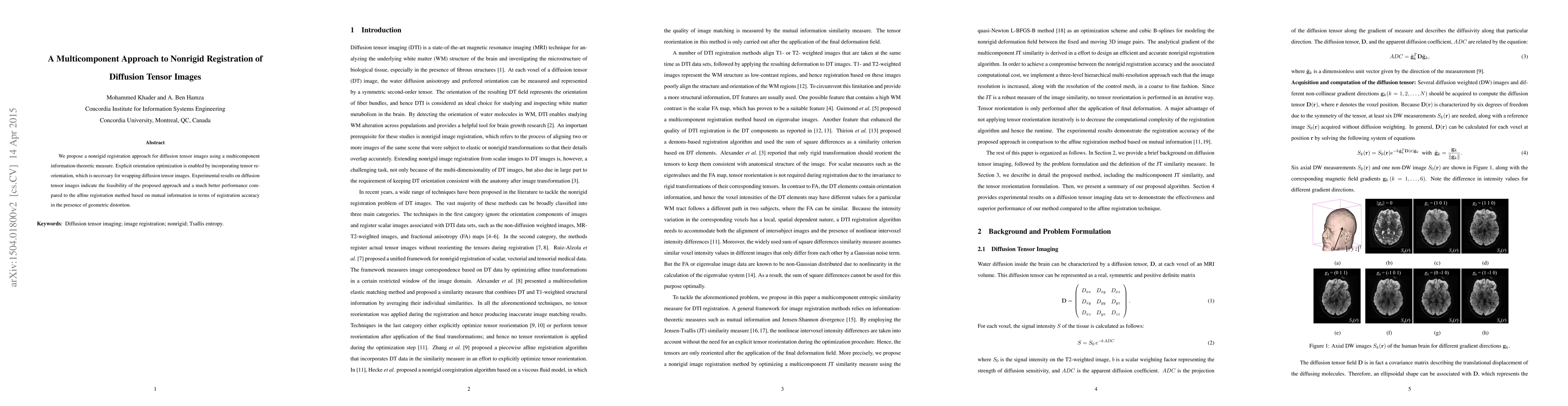 This paper introduces a nonrigid registration method for diffusion tensor images using a multicomponent information-theoretic measure, incorporating tensor reorientation for better accuracy. Experimental results show superior performance over affine registration methods in handling geometric distortions.