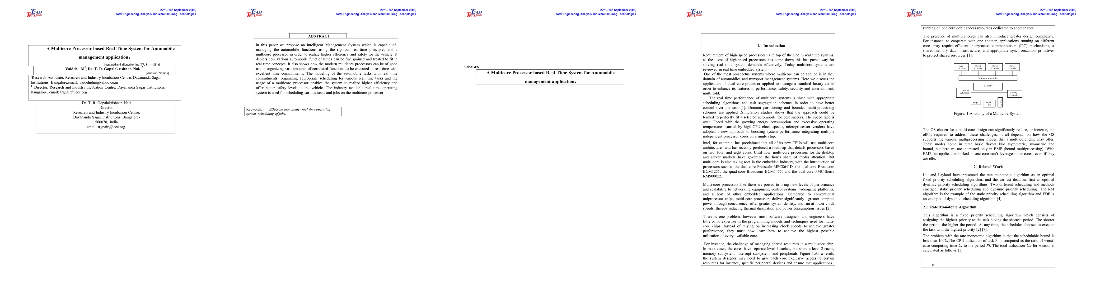 In this paper we propose an Intelligent Management System which is capable of managing the automobile functions using the rigorous real-time principles and a multicore processor in order to realize higher efficiency and safety for the vehicle. It depicts how various automobile functionalities can be fine grained and treated to fit in real time concepts. It also shows how the modern multicore processors can be of good use in organizing vast amounts of correlated functions to be executed in real-time with excellent time commitments. The modeling of the automobile tasks with real time commitments, organizing appropriate scheduling for various real time tasks and the usage of a multicore processor enables the system to realize higher efficiency and offer better safety levels to the vehicle. The industry available real time operating system is used for scheduling various tasks and jobs on the multicore processor.