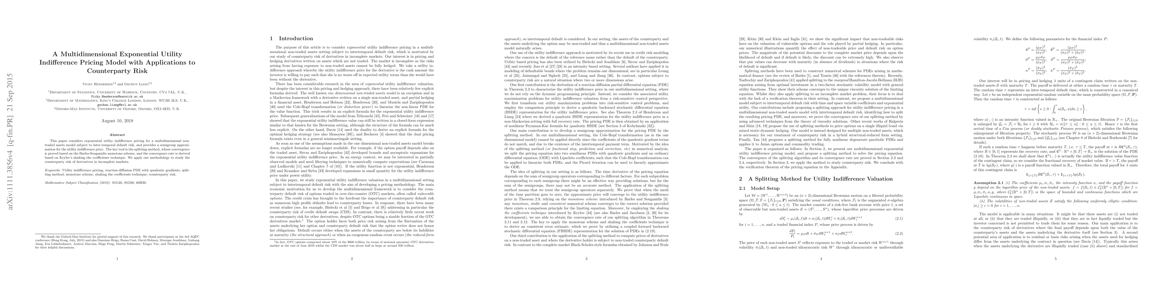 This paper develops an exponential utility indifference pricing model for multidimensional non-traded assets under inter-temporal default risk, utilizing a semigroup approximation and the splitting method. It applies the methodology to analyze counterparty risk in derivatives trading in incomplete markets.