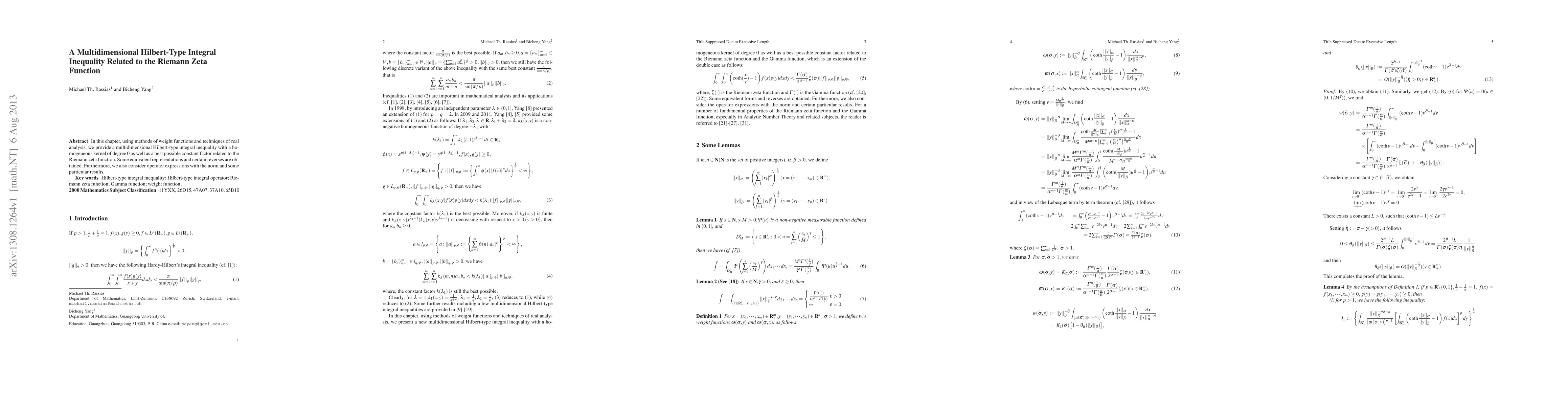 A multidimensional Hilbert-type integral inequality is established using weight functions and real analysis techniques, with a focus on the Riemann zeta function. The paper also explores equivalent representations and operator expressions with norm.